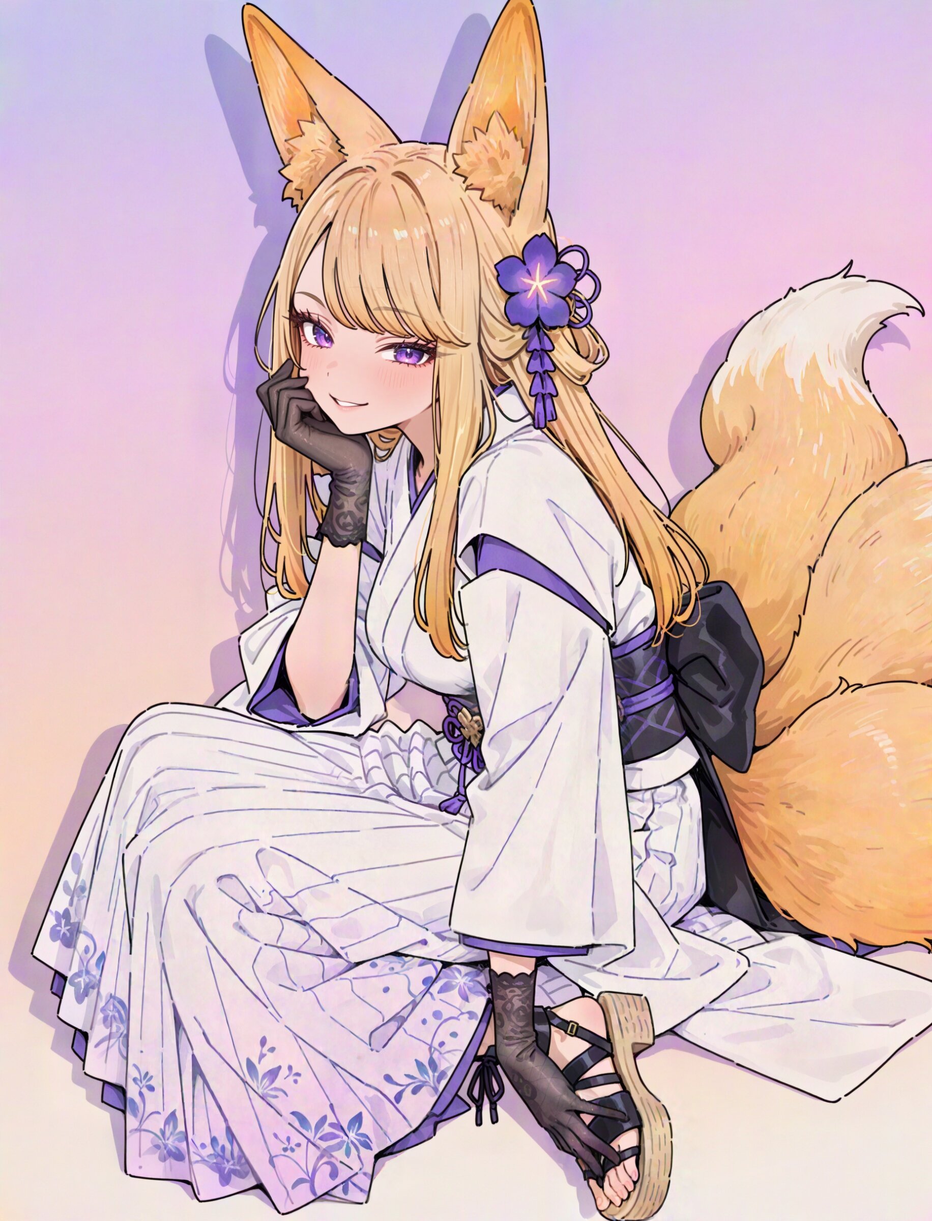 from side, (from above:1.2), (portrait:1.2), , looking at viewer, (gradient pastel color background:1.1), drop shadow, colored shadow, The background is a solid, bright indigo, creating a striking contrast with the intricate, multi-colored design of the character, ink wash effect, pop color background, (high saturation:1.2), summer coloring, 1girl, fox girl, gold Blond Hair, large breasts and fox ears, (swept bangs:1.2), (perfect purple eyes:1.3) long eyelashes aristocratic features tall girl has (Blond Hair long hair over ears:1.3) fox 9tails, (wearing White Japanese Cloth straw sandal black silk gloves long skirt Obi boots:1.3), hair ornament flower, tabi, detached sleeves, mysterious atmosphere, seductive smile, , sitting, jumping, super fine concept art, 8K, graceful eyes, masterpiece, best quality, amazing quality, very aesthetic, absurdres, newest, professional art lots of details, , overexposure, shiny-glistening, (watercolor style:1.0), (pastel color style:0.5) <lora:noline (1):0.8> <lora:sdxl2-flat2-512b:-0.5> <lora:facelightup_xl_v10:0.5>