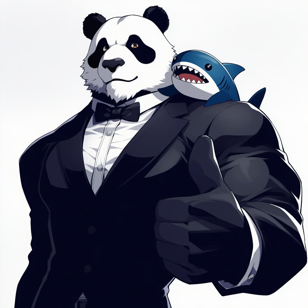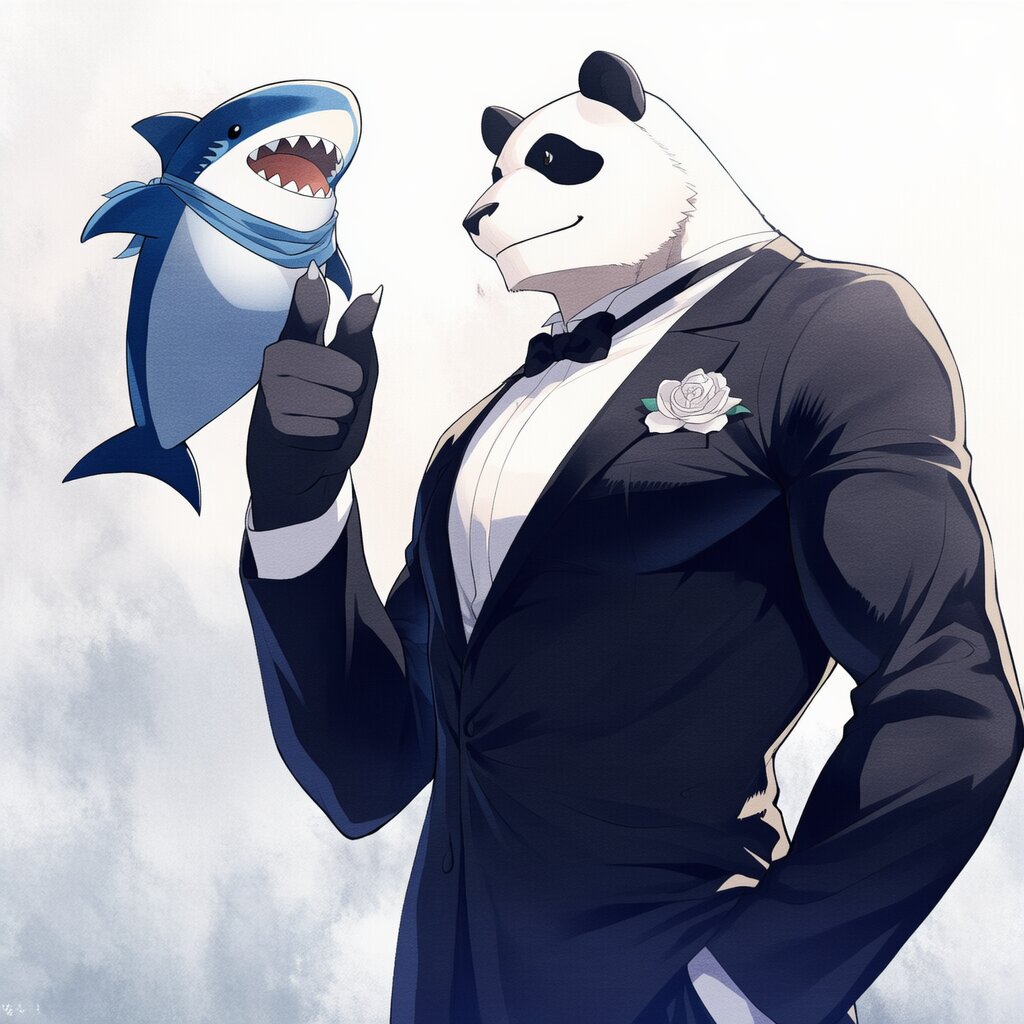(Watercolor painting:9.0),masterpiece,best quality,ultra detailed,({{{panda}}},Muscles,toned muscles,Bow tie,Handsome,Long legs,Tall,tuxedo,Thumbs up,light smile,friend),(Baby shark mascot with round eyes, sitting on a panda's shoulder,Throw a furoshiki around your neck),simple background,upper body,