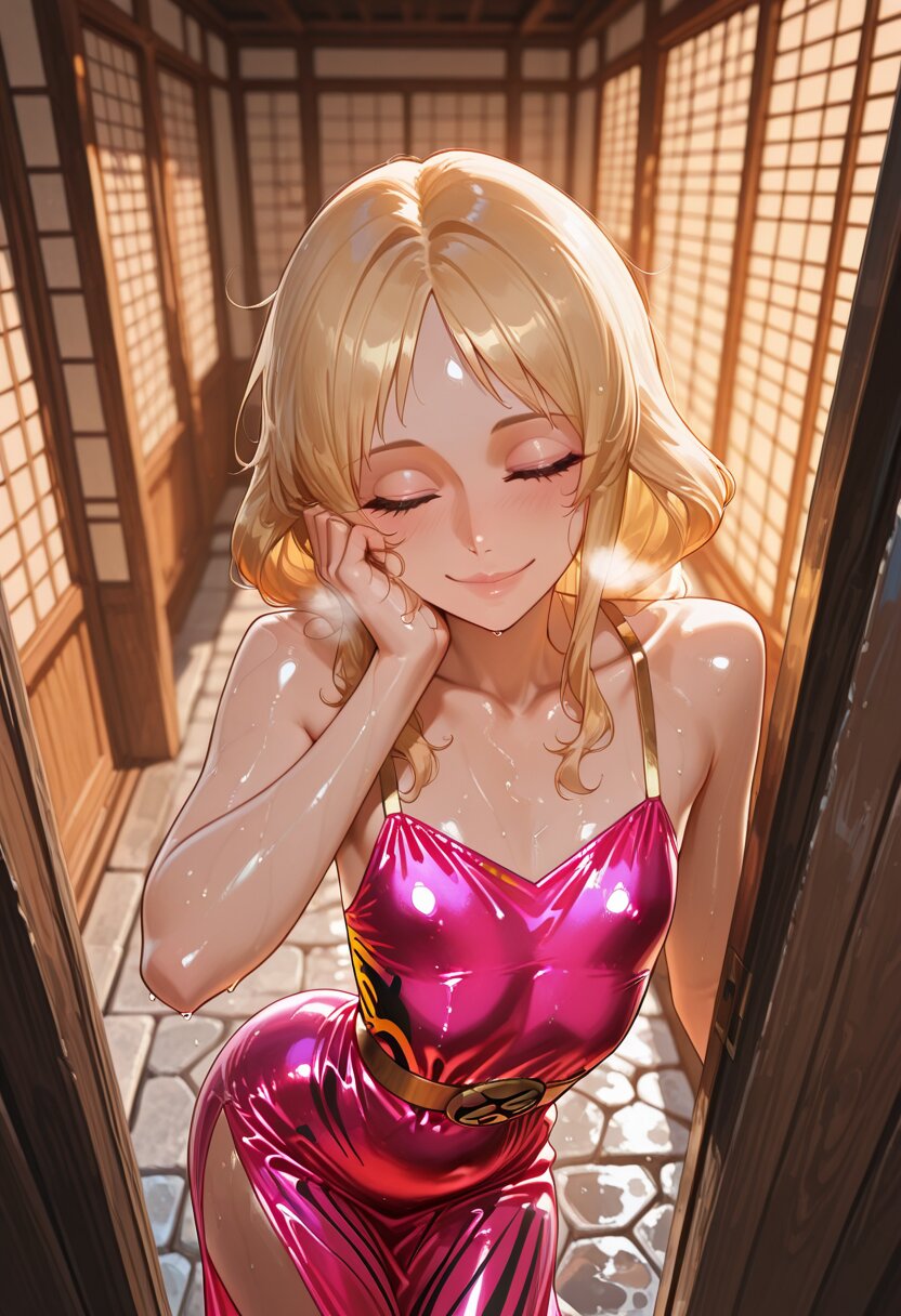 (1girl),(Expressiveh),masterpiece, best quality, amazing quality, very aesthetic, high resolution, ultra-detailed, absurdres, newest, scenery,tall and graceful, feminine shoulders, flat chest, subtle lift, rose gold and blonde, collarbone-length silky smooth hai,scarlet zebra-print wrap dress, crystals,contrapposto, full-length shot, hand on cheek, arched back, bust-up shot, slight smile, closed eyes, sleepy eyes, upward glance,,snowy sidewalk, window daylight, steamy window, midnight, reflections on wet ground, paper sliding doors,sunset tones, neon hues, cinematic tone, top-down glow, high angle, close-up, suggestive silhouette with deep tonal rang,,,BREAK, depth of field, volumetric lighting
