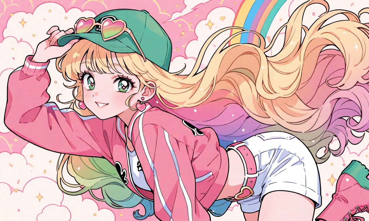 1girl, closed one eye, smiling, flying, one hand on cap, green cap, heart-shape sunglasses, pink frame sunglasses, fluffy perm-style long blonde hair, extremely long hair, blonde hair with rainbow inner layer, green eye, heart-shaped pupil, heart-shape pink earrings, white crop top with a black logo on it, pink cropped baseball jacket, white shorts, long pink boots, lace up boots, high-heeled boots, pink belt with gold heart-shape buckle, side view, heart explosion background, sunlight, pink clouds, rainbow, cute face, beautiful eyes, soft lips, solo, upper body, soft color, aegyo sal, perfect skin, beautiful face, Korean style, curly hair, colorful, retro pop, pop color tone, girly, super detailed, illustration, 8K wallpaper, pastel colors, masterpiece