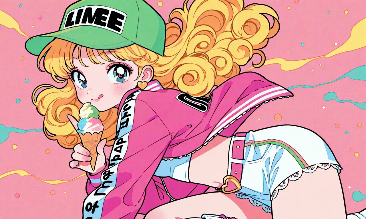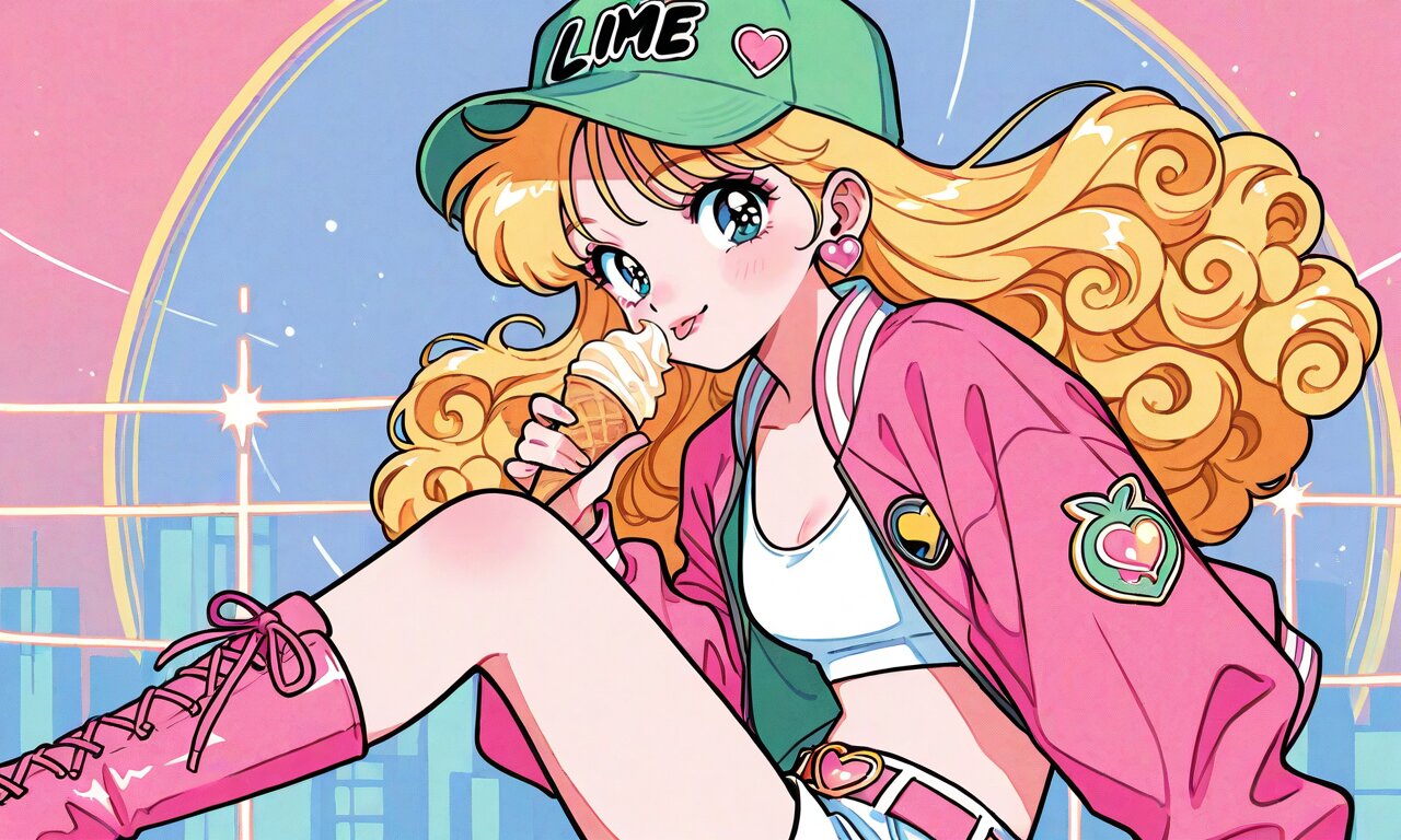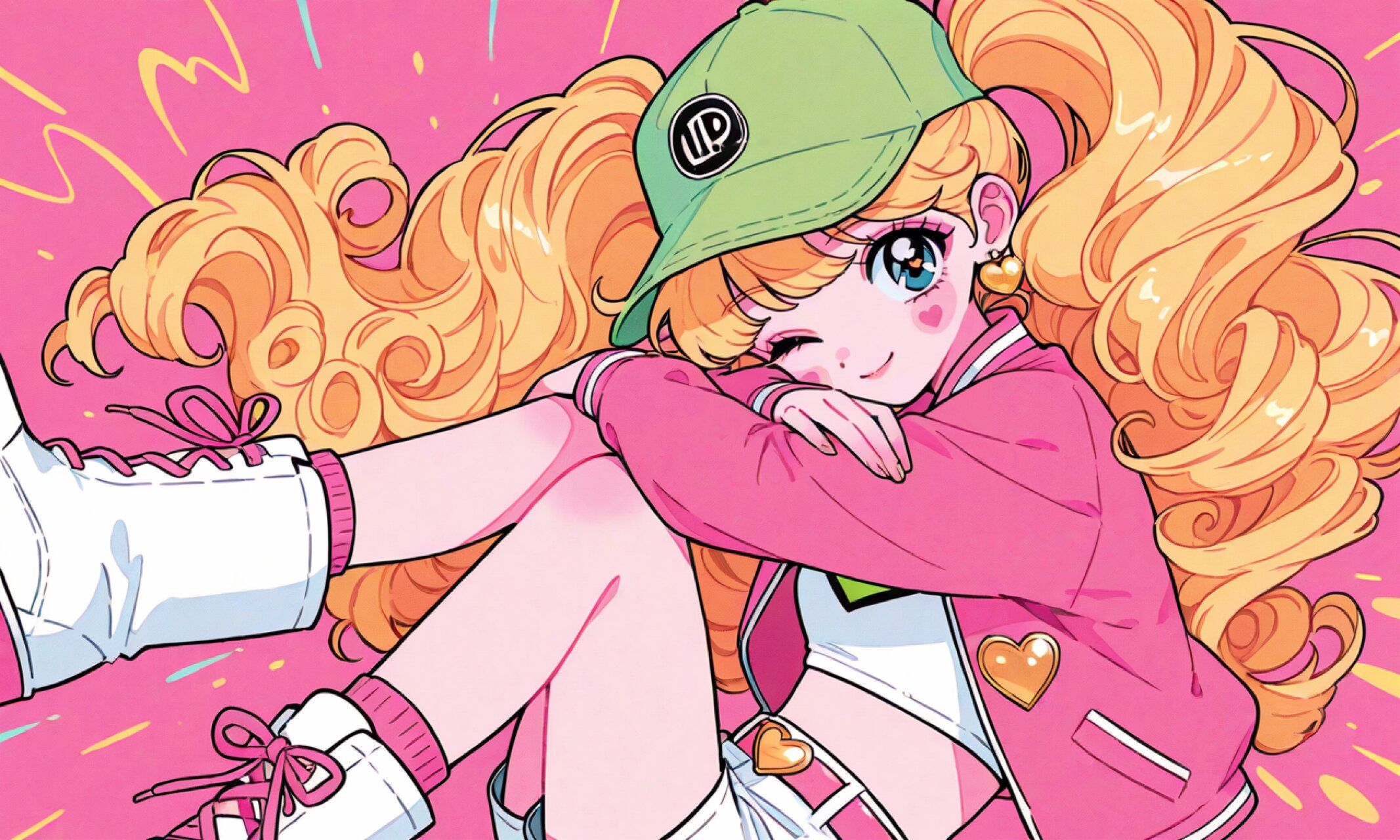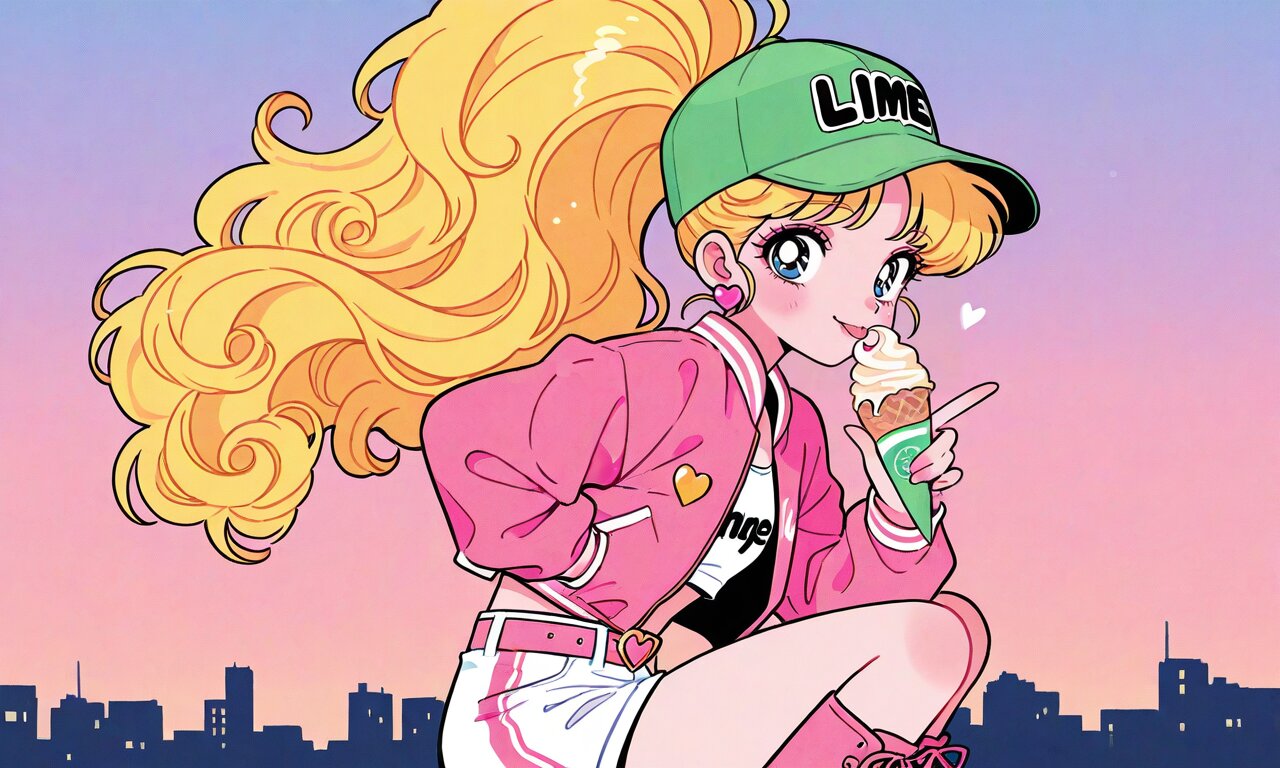1girl, lime green cap, fluffy perm-style long blonde hair, blue eyes, heart-shape pink earrings, white crop top with a black logo on it, pink cropped baseball jacket, white shorts, knee-high pink boots, lace up boots, high-heeled boots, pink belt with gold heart-shape buckle, closing one eye, smiling, standing, licking white ice cream, side view, evening city background, sunlight, cute face, beautiful eyes, soft lips, solo, focus face, upper body, soft color, aegyo sal, perfect skin, beautiful face, Korean style, curly hair, colorful, retro pop, pop color tone, girly, super detailed, illustration, 8K wallpaper, fine eyes, pastel colors
