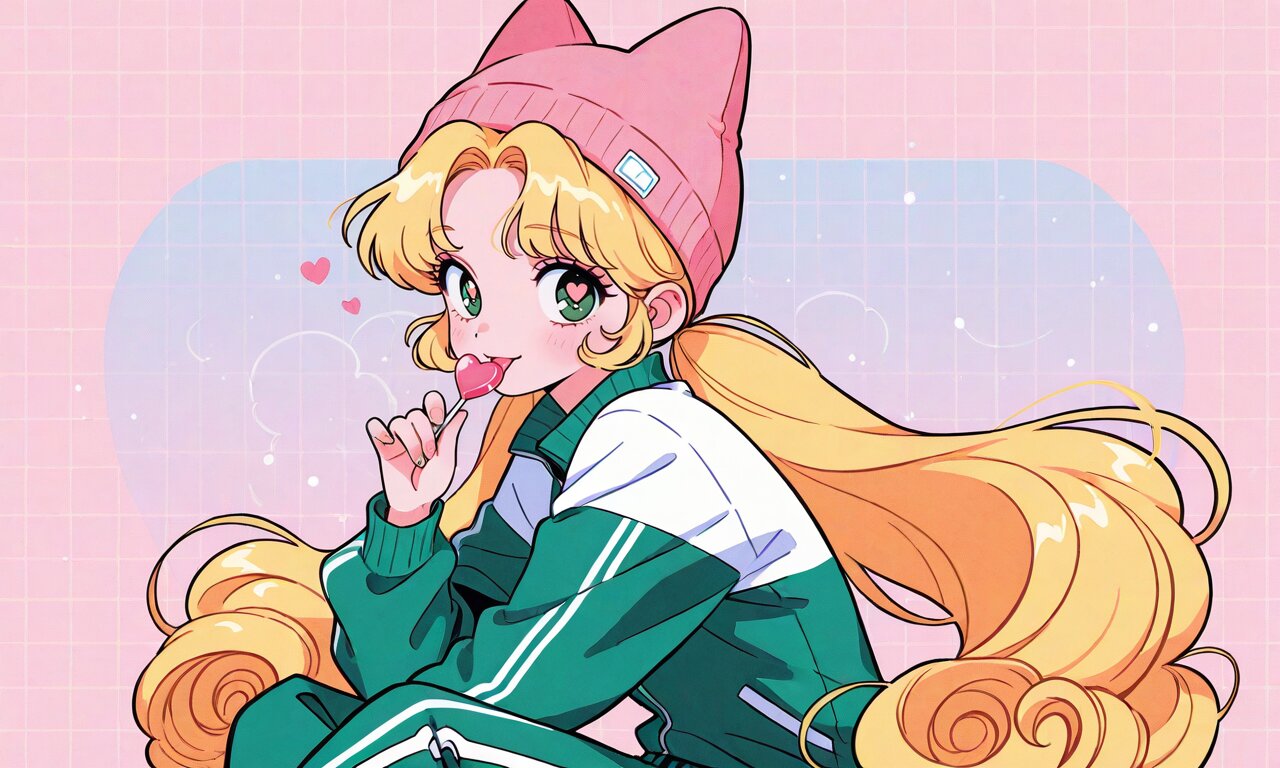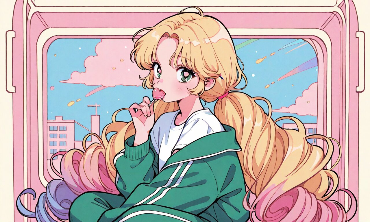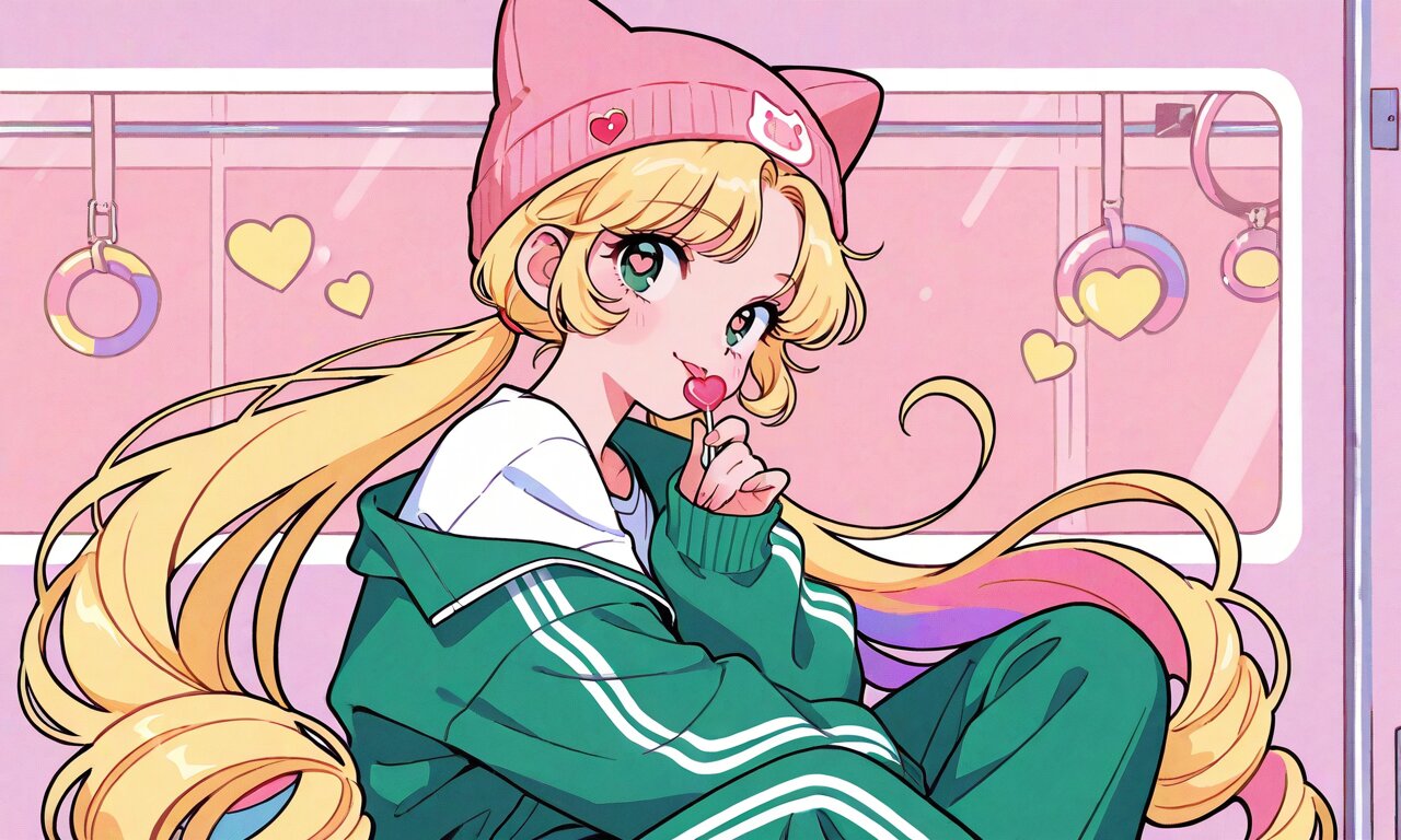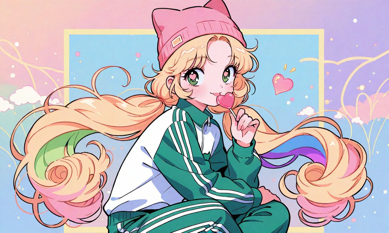 1girl, pink beanie, cat ear beanie, sideways glance, sitting, indian style, parted bangs, fluffy perm-style long blonde hair, blonde hair with rainbow inner layer, low twin tails, extremely long hair, flipping hair, green eyes, heart-shaped pupils, white solid t-shirt, green track suit top, long sleeve top, green track suit pants, long sleeve pants, licking pink heart-shape lollipop, cowboy shot, from side, sunlight, train background, smiling, beautiful eyes, soft lips, solo, soft color, aegyo sal, perfect skin, beautiful face, Korean style, curly hair, colorful, retro pop, pop color tone, girly, super detailed, illustration, 8K wallpaper, pastel colors, masterpiece, flying hearts