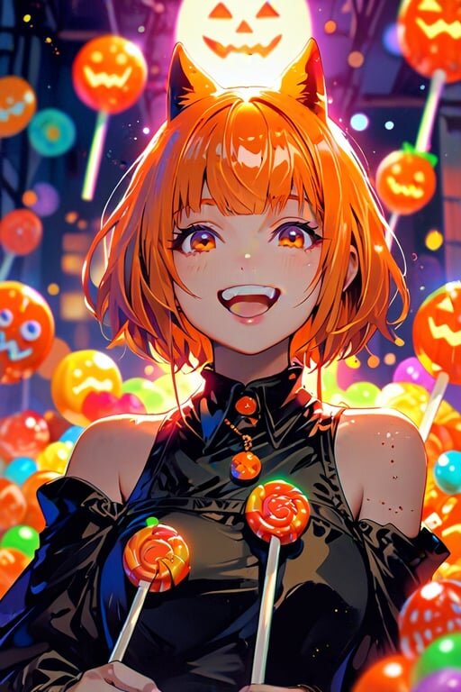 Main Subject (Zena) (Japanese idol Zena:1.4), (orange bob haircut:1.5) softly glowing under colorful lights, (pastel orange headphones:1.3) resting around her neck, signature accessory emphasizing her idol identity. Outfit: (open-shoulder Halloween-inspired costume:1.5) with playful frills and candy motifs, paired with a (mini skirt:1.5) that enhances her vibrant pop-idol style. Expression: (bright, mischievous smile:1.4), blending idol cuteness with a hint of zombie playfulness. --- Props & Setting Surrounded by (Halloween sweets and candy:1.6) — lollipops, gummy bears, cupcakes with ghost toppers, pumpkin macarons, chocolate bats scattered around her. A (giant pastel lollipop prop:1.4) is held playfully like a zombie’s weapon, symbolizing the “candy zombie uprising.” (Jack-o’-lanterns:1.3) glow warmly in the background, casting soft highlights on her hair and outfit. The ground sparkles with (scattered candy wrappers:1.2), adding texture and energy to the scene. --- Lighting & Photography Lighting: (professional studio setup:1.4) with (soft diffused key light:1.5) highlighting Zena’s face and outfit, accentuating fabric details and candy shine. (Colorful accent lights:1.3) — pastel pink, mint, and violet — simulate candy reflections and create a dreamy, surreal Halloween pop atmosphere. Composition: (low-angle framing:1.3) with candies spread across the foreground, guiding the viewer’s eyes toward Zena. Lens: (35mm wide portrait lens:1.3), capturing both subject and e