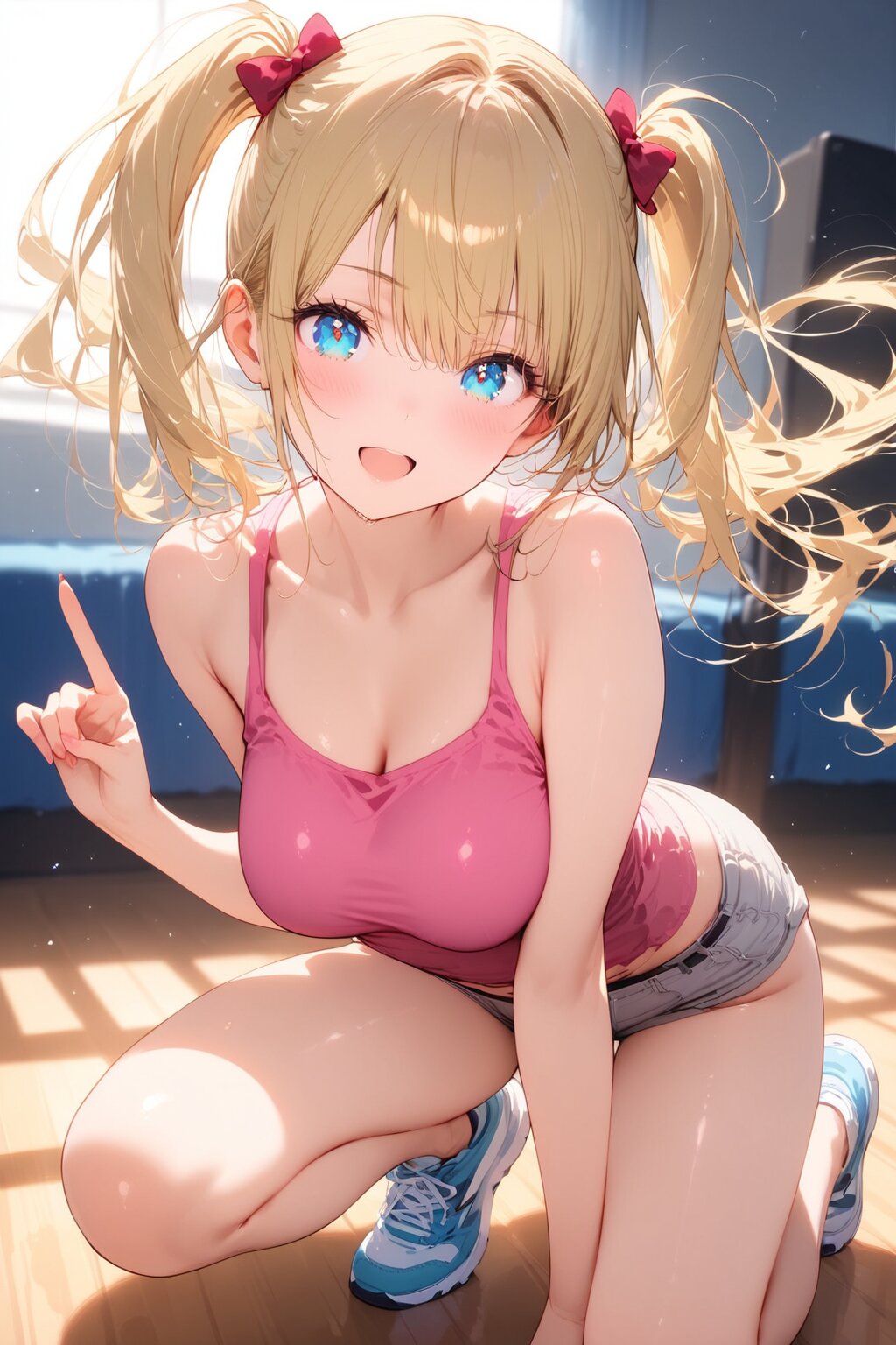 sporty clothes, shorts, sneakers Dynamic poses, dynamic angles, waving hands white background BREAK (eye highlight: 1.3) (detailed description: 1.3), (Pretty Girl: 1.3) (anime style: 1.2) (full body: 0.8) BREAK (masterpiece), (top quality: 1.4), (best image quality), (high resolution), (perfect anatomy), (8K), (sharp), (depth of field), (very detailed, delicate and beautiful figures), (very fine and beautiful line art), (Delicate Glow), (Clear), (Large File Size), (Ultra Fine Illustration), (Delicate for Illustrations), (Clear Focus), (Clear Lines), (Brilliant Color), (Perfect Lighting), (Perfect Body), (Perfect Hand, Perfect Finger, Beautiful Hand Shape, Beautiful Finger Shape) BREAK (1 girl), (18 years old), (cute girl), (beautiful girl) BREAK (long twin tails up to waist, blond hair, loose flowing bangs)), (beautiful hair), (smooth hair), (cute little bows on both sides of the twin tails) BREAK (bright highlights), (transparent blue eyes), (delicate eyes), (beautiful eyes), (beautiful eye shape), BREAK (Clear Skin), (Realistic Skin) BREAK (E cup breasts)