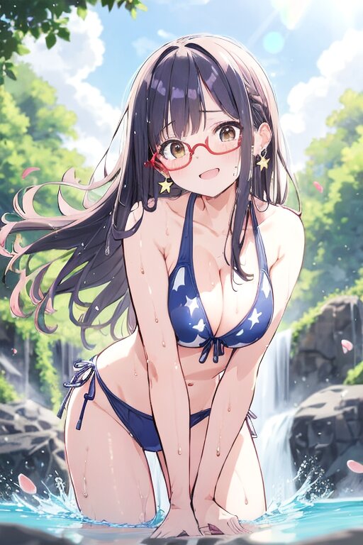 ((best quality, high resolution)), (delicate illustration), (pastelcolor style illustration:0.4), (watercolor style illustration:0.4), ((beautiful:1.3)), 4k,Perfect Anatomy, 1girl, brown eyes are shining and cute,black hair,long hair,(red-rimless eyewear:1.2),star earrings,fabrous feminie softy breast, cute swimsuit,Wink, close one eye,Lakes,large waterfalls,Surface water, Many flowers floating on the water,Surface water,Great fun,Wet hair, wet, splashes of water,summer sunlight,Soft Wind, petals falling,pretty little girl,blush,sunflower hair accessory,blush,smile,great joy,cleavage, Looking at the viewer,Leaning forward
