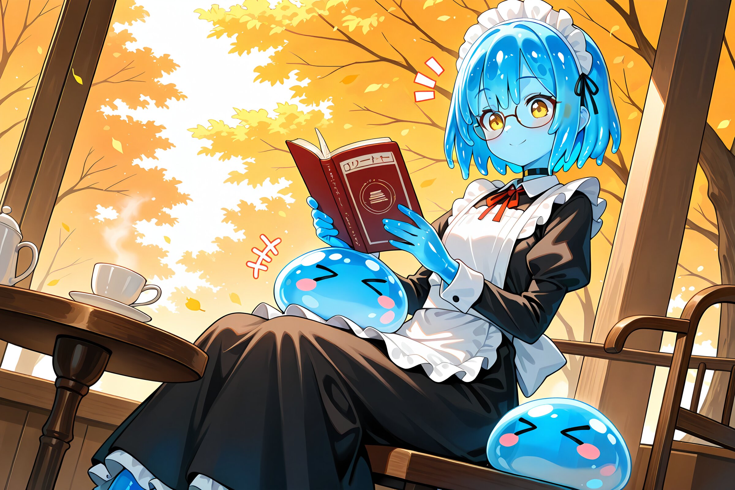 1 little girl, solo, diagonal angle, masterpiece, best quality, amazing quality, very aesthetic, blue slime girl, blue hair, short hair, yellow eyes, slime skin, closed mouth, smile, cheerful, +++, notice lines, choker, maid outfit, maid headdress, glasses, long skirt, sitting, reading a book, holding slime, > <, in cafe, autumn, sunlitht,