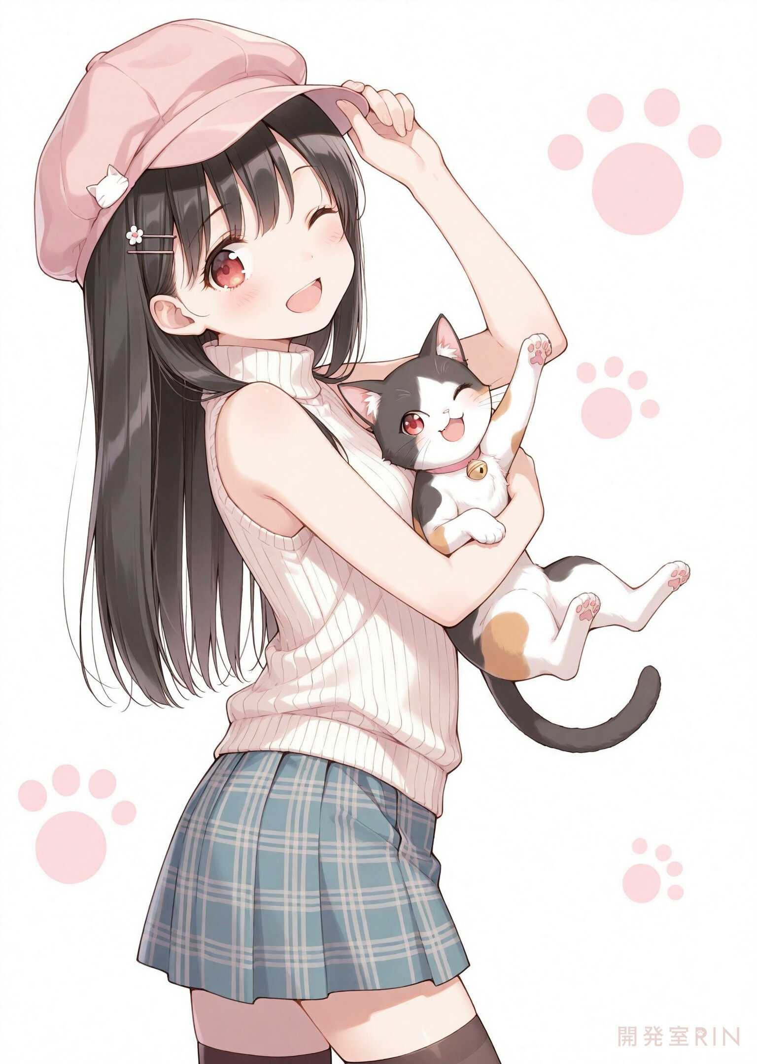 (flat color:0.15),(tareme:0.3), cute girl, red eyes, straight hair ,black hair ,(hair between eyes:0.5), hairpin, kawaii, (pastel theme :0.1), (depth of field:0.0), (bokeh:0.5) , head tilt, holding cat, ;d,( from below:0.7), (from side:0.6), BREAK cat , paw up, (playful cat :1.3), ( simple background:0.9), plaid skirt, ribbed sweater, hand up, contrapposto, thighhighs, hand on headwear, casual, sleeveless turtleneck, (dynamic pose:0.1),