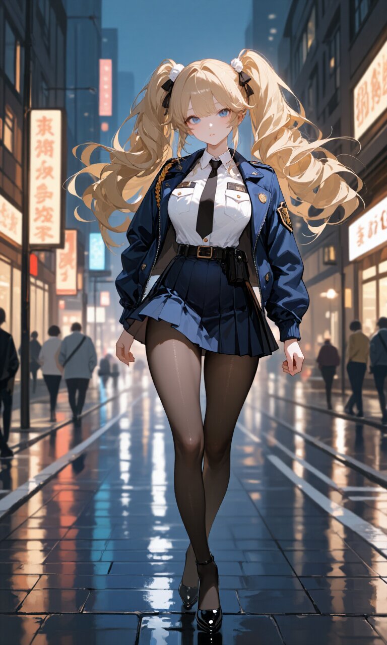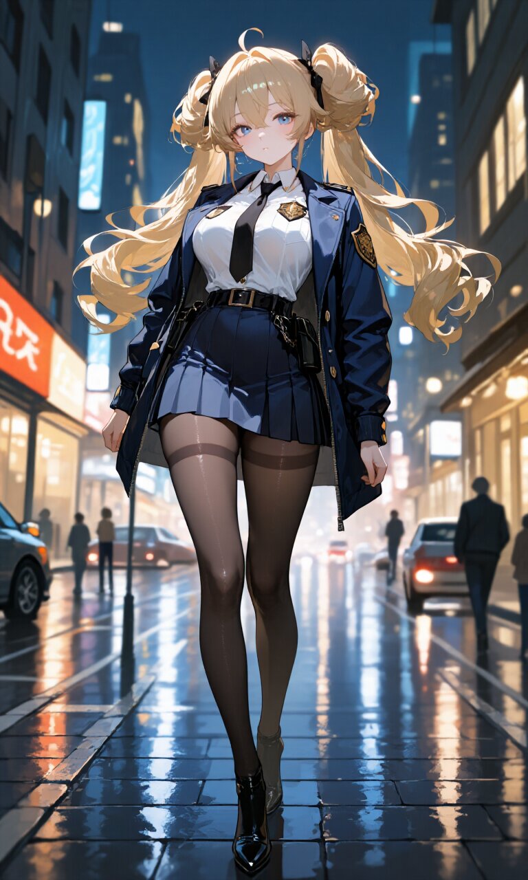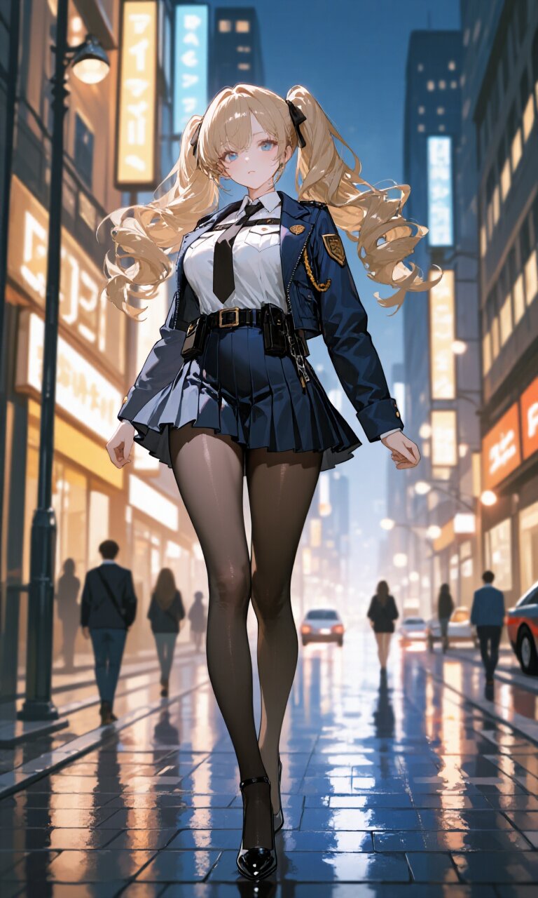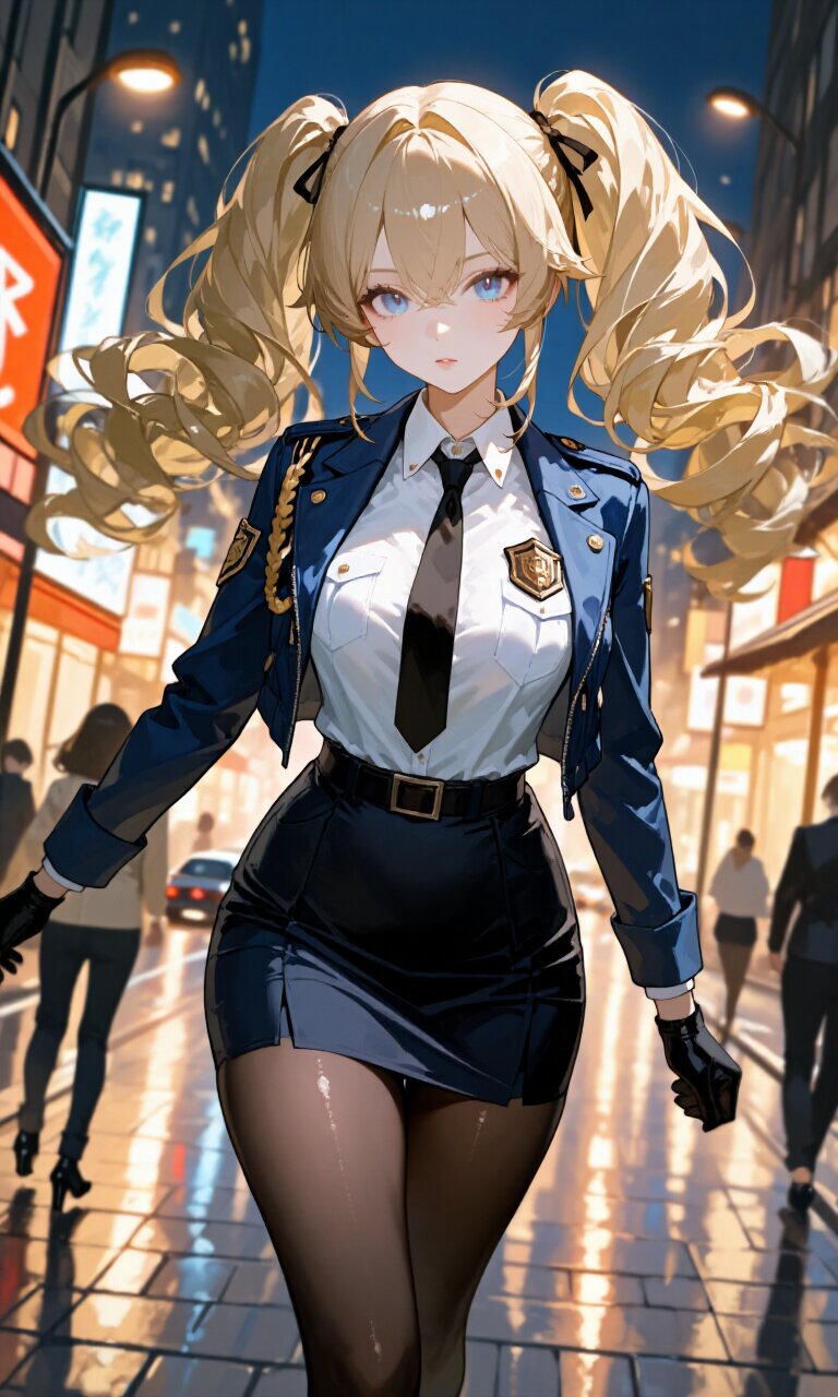 Blonde with large twin tails, a beauty with blue eyes, wearing a police officer's uniform, a miniskirt, and black high heels, patrolling the night streets.