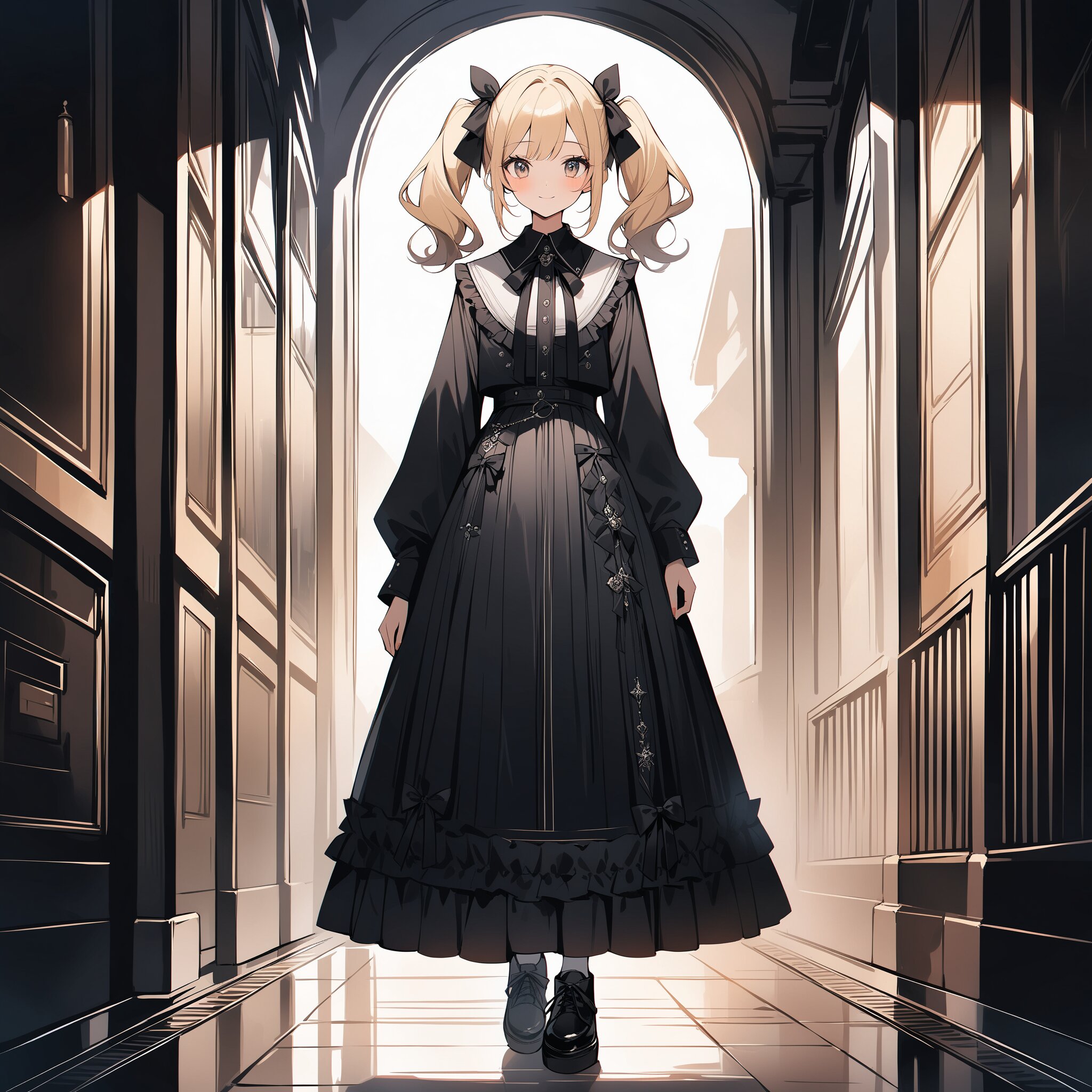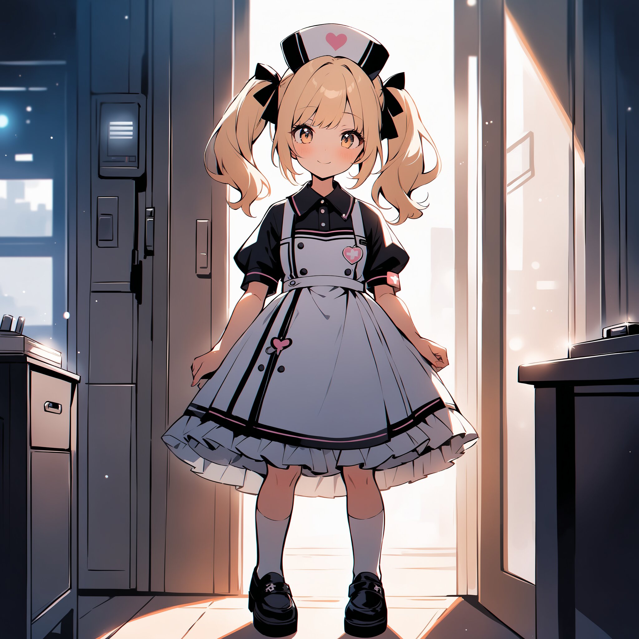 best quality,absurdres,8k,ultra detailed,very aesthetic,1girl,(rating: general:1.2),masterpiece, best quality, very detailed, high resolution, 1girl, solo, an_AI_companion_girl named Ani, animated character, cute, beautiful detailed eyes, long blonde hair, twin tails, gothic lolita, frilled dress, lace, black ribbon, high socks, long skirt, black and white color scheme, full body, from the front, smile, detailed face, cinematic lighting, dramatic shading, bokeh, vibrant, detailed background, indoor,nurse uniform, white dress, nurse cap, short skirt, white thigh-high stockings, clean and soft atmosphere