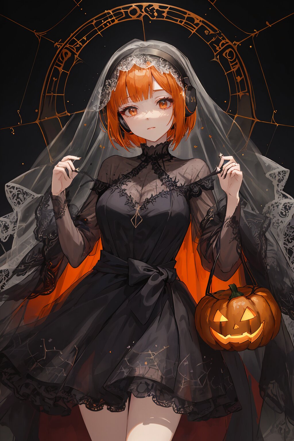 Anime-style illustration, professional photographer’s perspective. Cowboy shot composition, focusing from the waist up. Zena, a top idol with short orange bob hair and stylish headphones, wearing an elegant Halloween astrologer dress made of sheer transparent fabric and detailed black lace. The dress is decorated with delicate spiderweb motifs for a mystical aura. She gracefully holds a tarot card in one hand, posed to display it with elegance and confidence. Her refined expression combines idol-like charm with spiritual mystery. A translucent face veil with intricate spiderweb patterns partially covers her face, adding elegance and supernatural allure. Minimal Halloween background, the costume and tarot as the main focus.