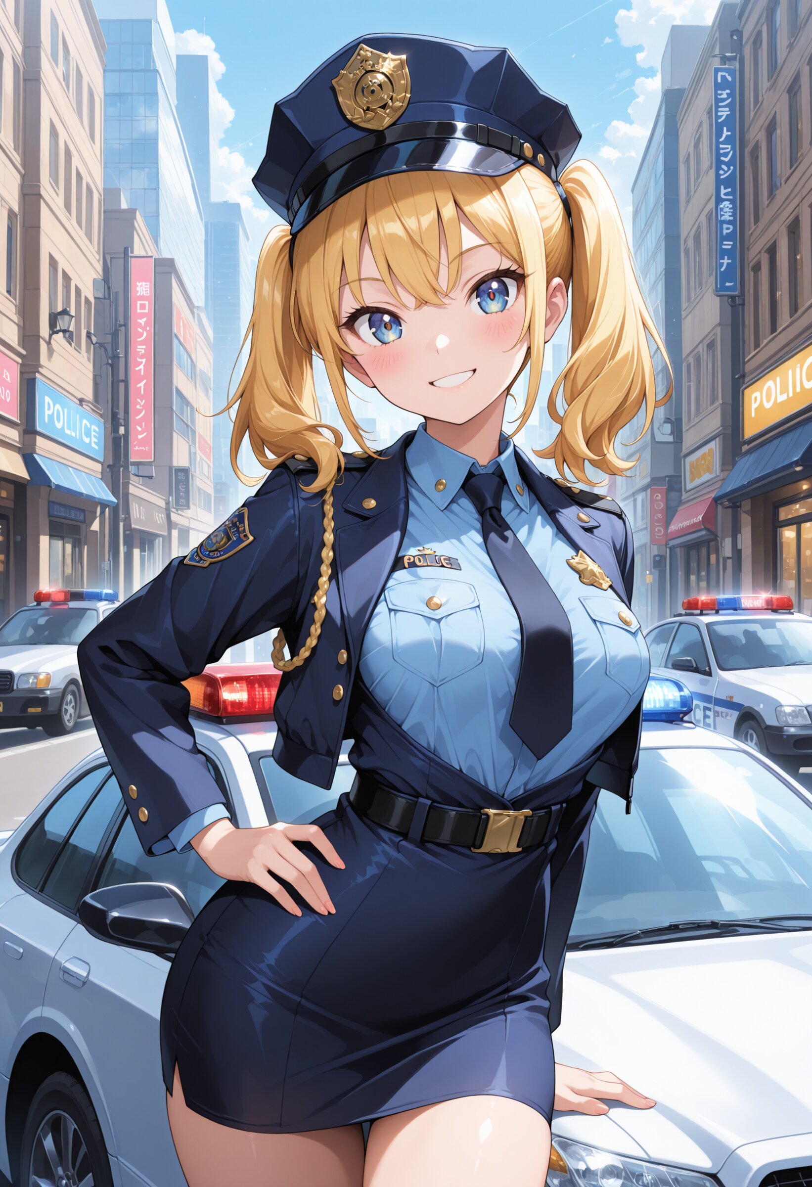 masterpiece, best quality, ultra-detailed, anime style, 1girl, blonde medium hair, twin tails, blue tsurime eyes, cool and cute expression, confident smile, blush, medium breasts, wearing a stylish police officer cosplay outfit, short skirt uniform with navy blue and black accents, fitted jacket with gold buttons, tie and police cap, playful yet authoritative design, leaning casually against a police car, confident and relaxed pose, city street background, daytime, shine colorful, vibrant and detailed illustration