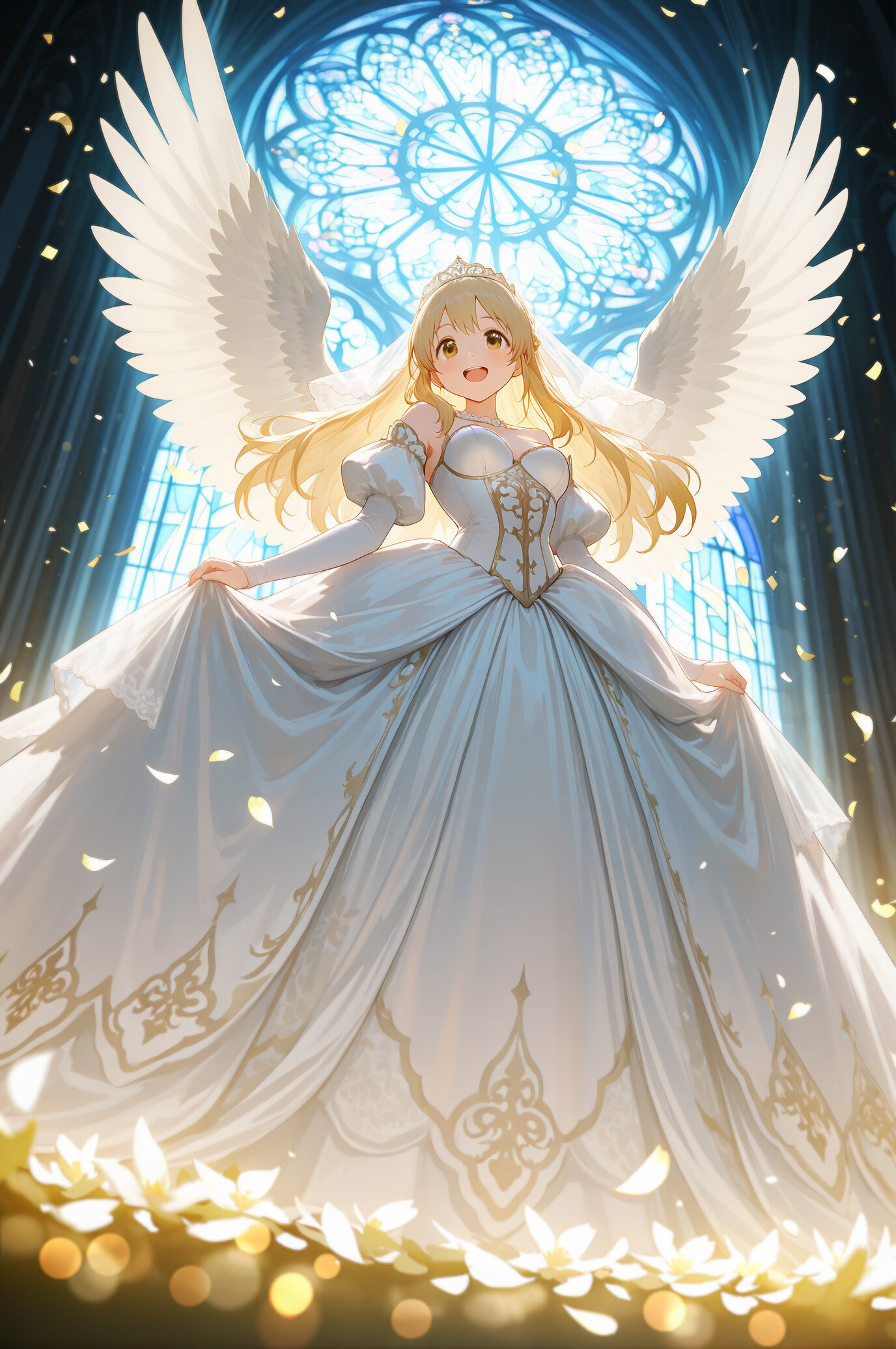 masterpiece, best quality, absurdres, 8k, ultra detailed, aesthetic, very aesthetic, newest, <lora:Fixhands_anime_bdsqlsz_V1:0.5>, <lora:bold-16oa:-0.5>, (realistic:0.3),BREAK (bokeh,shallow depth of field,Gaussian Blur:1.6),lens flare,1girl, A stunning bride wearing a luxurious white ball gown style wedding dress, princess silhouette, fitted bodice with a full voluminous skirt, richly decorated with ornate lace, pearls and jewels, standing gracefully in front of a grand church stained glass window. The scene is illuminated with dramatic, fantasy-like lighting, ethereal and majestic atmosphere, highly detailed, elegant, cinematic, fantasy art, ,(smile,happy,tareme:1.3),(colorful laser light:1.2),blonde hair, long hair, brown eyes, (white angel wings:1.2),tiara,french bride,from below,open mouth,(fullbody shot,from below,wide angle,wide shot:1.3),(petals,confetti:1.3)(medium breasts,curvy:1.3), <lora:USNR STYLE_XL_loha:0.8>