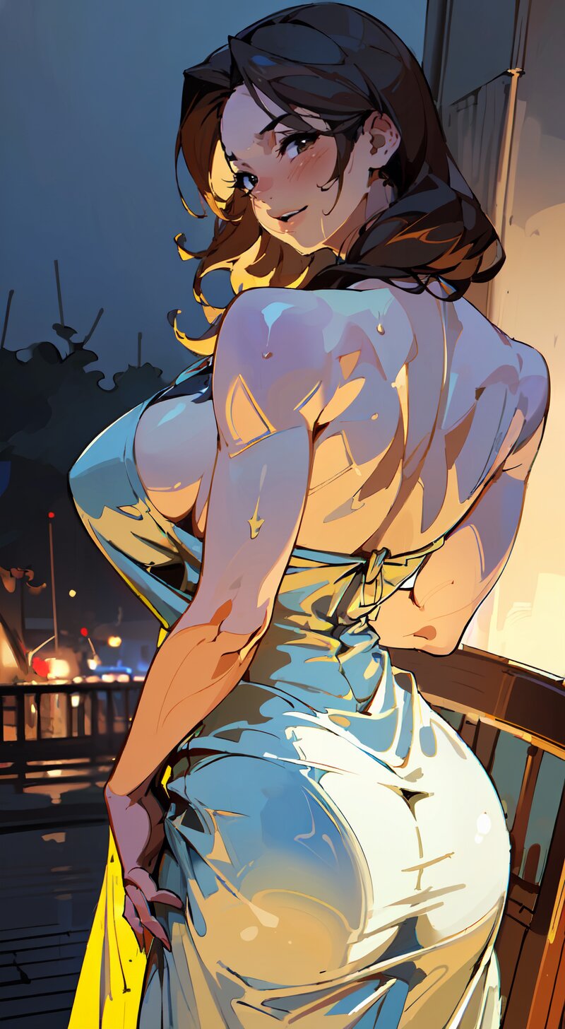 (cowboy shot: 1.2), (from back: 1.6), (8k, best quality, masterpiece:1.8), (realistic:1.6), HDR, (incredibly absurdres:1.2), (vibrant color:1.2), ultra-detailed, 1woman, solo, 42 years old, (slender, gigantic breasts, big ass: 1.4), medium hair, perfect body, highly detailed, looking at viewer, (sexy night dress: 1.8), (standing beside of chair:1.6), in the bedroom, <lora:mitsuko_v01:0.8>