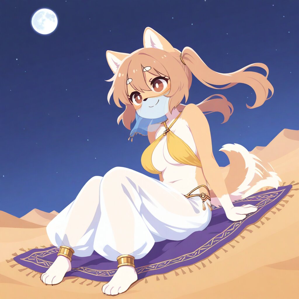 1girl, solo, short female, oppai loli, dog girl, shiba-inu girl, furry:1.3, shiba-inu ears, ears up, shiba-inu tail, body fur:1.2, stand fur, curled tail, large breasts, light-brown hair, long hair, long twintail, high twintail, white thick eyebrows, hair between eyes, brown eyes, round eyes, bright pupils, smile, closed mouth, harem outfit, layering, arabian clothes, mouth veil, yellow sling bikini top, criss-cross halter sling bikini top, harem pants, light motion lines, motion trails, motion blur, afterimage, sitting on magic carpet, midair, flying, tail wagging, starry night, desert, floating hair, fullmoon, from front, dynamic angle, three quarter view, looking ahead, hair shade, high contrast, anime coloring, kawaii, softy, 2D, cute, furry, two tone fur, furry body, perfect body, detailed face, high quality, cute clothes, animal tail, animal ears, solo, masterpiece, correct_anatomy, Bright colors, Contour line, pale painting, gddw, flat color, no lineart, lolitaaa, girl, small body, short girl, petite, very short, tiny, cute, pretty and cute, chibi, masterpiece, comical, simple, smile