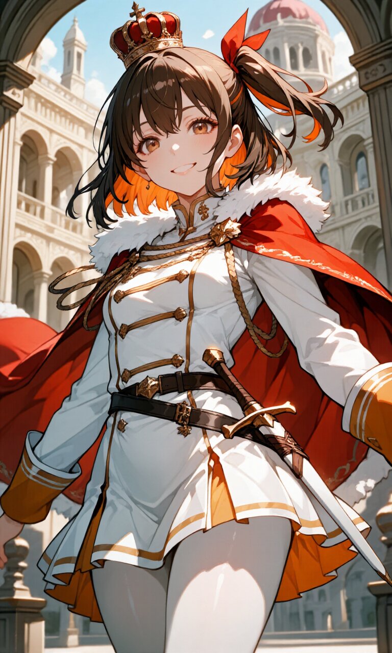 lococo, mio_(orange_juice), a 17-year-old girl with a cheerful face and a happy expression, stands in a grand palace with lococo architecture. She has detailed brown eyes with double eyelids, a cute smile, and detailed lips. Her hair is medium-length with long side bangs, a ponytail, brown hair, and orange inner highlights, tied with a red hair ribbon. She wears a white prince costume with a red cape, long sleeves, a mini skirt, white tights, and a crown. A dagger is sheathed at her waist, and her slender body has small breasts. She looks directly at the viewer with a confident and romantic pose. The background features intricate palace details with natural daytime lighting, creating a warm and detailed illustration style. The mood is romantic, with outstanding intricacies and a polished, anti-aliased finish.