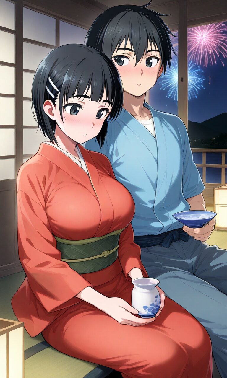 Couple, boy and girl, two people only,absurdres, ultra-detailed, master piece, high resolution, 8k, Boy, girl, couple,NSFW, masterpiece, best quality, extremely detailed, full color, beautiful detailed young woman, wearing loosened red kimono with floral patterns, breasts partially exposed, shiny skin flushed, hair disheveled, eyes glazed with exhilaration, young man watching with curious eyes, houseboat interior, fireworks outside, sake cup spilled, perfect anatomy, explicit sake-induced tease. BREAK the boy(original boy,black hair,short hair, black eyes) BREAK the girl(suguha, short hair, hairclip, large breasts,, )