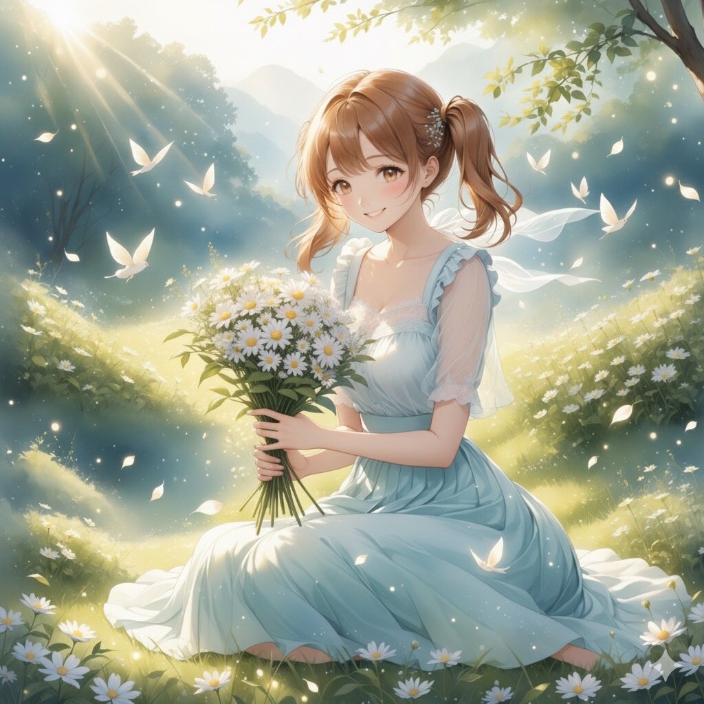 (1girl:1.2), (brown short twintail hair:1.3), (early summer fashion, light blouse, flowy skirt:1.1), (sitting on sunlit grassy meadow:1.0), (holding small bouquet of wildflowers:1.1), (gentle breeze flowing through hair and skirt:1.2), (serene and dreamy smile:1.3), (soft sunlight filtering through translucent leaves:1.2), (sparkling light particles:1.3), (pastel color palette:1.1), (glowing skin:1.2), (delicate facial features:1.3), (ethereal and airy atmosphere:1.4), (dreamy watercolor illustration style:1.3), (soft gradients:1.2), (subtle watercolor bleeding and texture:1.2), (soft focus:1.1), (cinematic composition:1.1), (high detail:1.3), (slight bloom and lens flare effect:1.1), (floating petals:1.2), (magical and tranquil ambiance:1.3), ultra-detailed, finely textured, intricate linework, realistic hair shading, realistic fabric folds, luminous skin highlights, soft shadows, volumetric lighting, realistic flower petals, soft atmospheric haze, natural color transitions, high-resolution watercolor texture, subtle bokeh