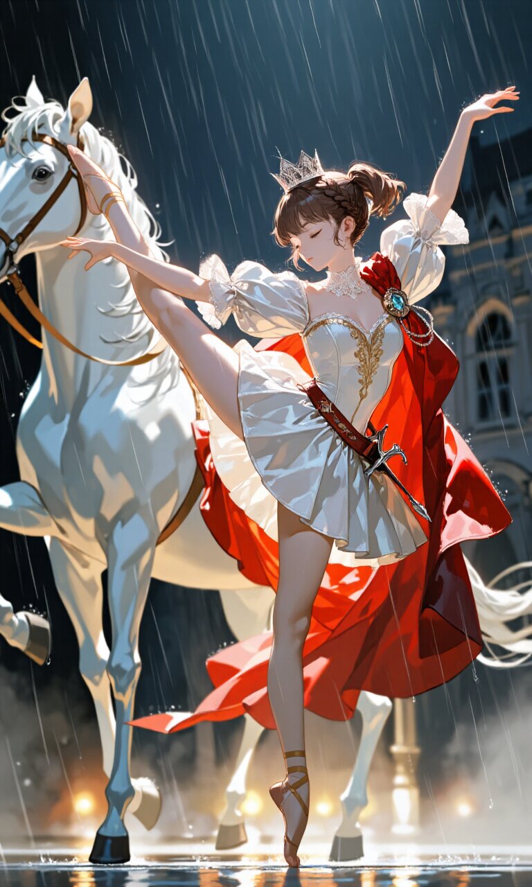 A breathtakingly detailed photorealistic anime-style depiction of a young woman dancing ballet in the rain at night. She has delicate, refined facial features with closed eyes and slightly parted lips, exuding serene emotion. Her short brown twintail hair is styled with intricate french braids, swaying dynamically as she moves. She wears an elegant white prince costume with puff short sleeves, a flowing red cape, and a mini skirt that flutters with her motion. A jeweled crown rests atop her head, and a dagger is sheathed at her waist. She stands gracefully on one leg in a standing split pose, arms raised elegantly, barefoot with visible toes touching the wet ground. The scene features a majestic white horse nearby and rococo architecture in the blurred background. Rain falls in delicate strands, creating watercolor-like effects as it interacts with dynamic lighting—cold hues contrasting with warm glows from unseen light sources. The atmosphere is hazy with bloom effects, dust particles, and depth of field emphasizing the romantic academia aesthetic. Every detail is hyperrealistic, from the texture of her costume to individual raindrops catching the light.