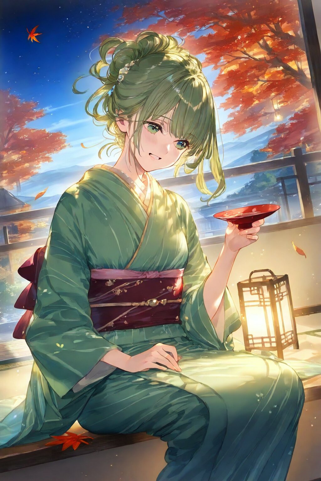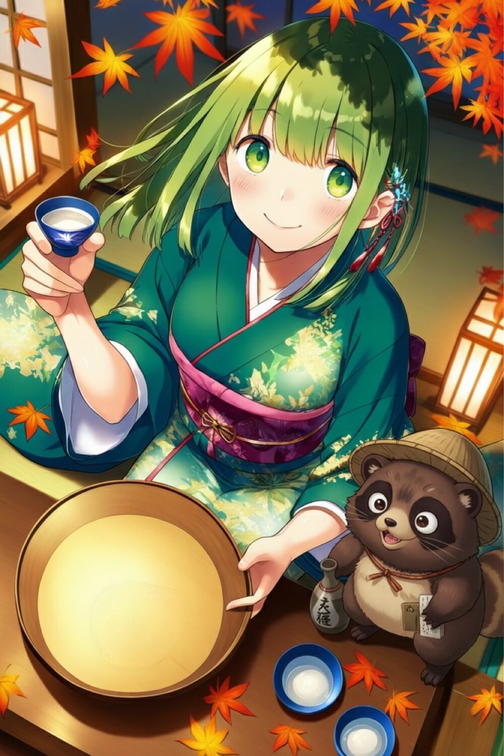 1 girl, watercolor painting, soft and delicate brush strokes, highly detailed, intricate details, long straight green hair, green eyes, detailed green kimono with traditional patterns, sitting on tatami or scattered autumn leaves, holding a small sake cup in one hand, offering wagashi with the other, gentle smile, serene and playful expression, vertical composition, textured paper effect, realistic soft lighting, warm shadows, depth of field, dramatic night scene, vivid autumn colors, illuminated maple trees and leaves, glowing lanterns casting soft reflections, falling leaves swirling around, subtle wind moving hair and kimono, magical and cozy atmosphere, (Gasha Dokuro (hungry skeleton) peeking from shadows:0.8), (Bunbuku Chagama tanuki sitting nearby:0.7), dynamic composition with foreground elements like colorful leaves and wagashi to create depth, soft reflections of lanterns on nearby surfaces, mystical yet elegant ambiance, painterly watercolor texture with flowing colors, slightly blurred edges for artistic softness, high attention to small details such as kimono folds, hair strands, and leaf textures