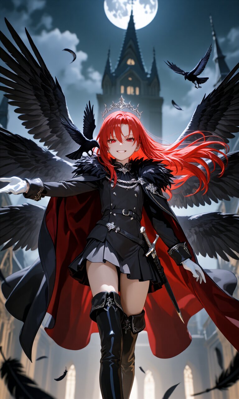 A stunningly detailed 2D anime-style woman with six large black crow wings (multiple layered wings with intricate feather patterns) stands proudly in a gothic midnight setting. Her long, flowing red hair blows dramatically in the wind, framing her delicate, photorealistic face with sharp red eyes. She wears a Black Prince costume consisting of a mini skirt, long sleeves, white gloves, black luxurious boots, and a dark red luxurious cape that billows behind her. A delicate crown rests atop her head while a dagger hangs at her waist. Her flat-chested figure stands confidently with an intelligent, grinning expression directed at the viewer. The background features gothic architecture bathed in moonlight, with rim lighting accentuating her silhouette against the dark sky where a full moon shines. The hyperrealistic image captures every detail from individual feathers in her wings to the texture of her gloves, all rendered in 8K quality with masterful lighting that creates a perfect dark academia atmosphere.