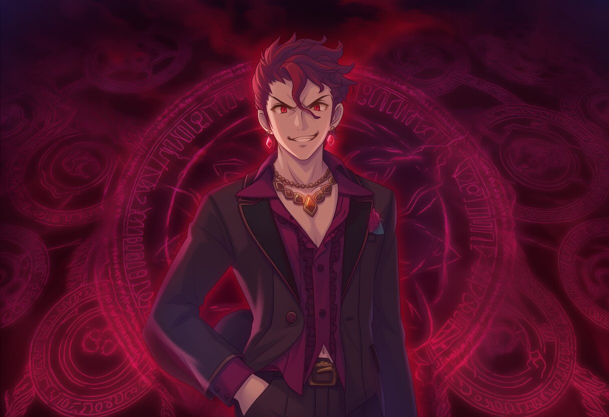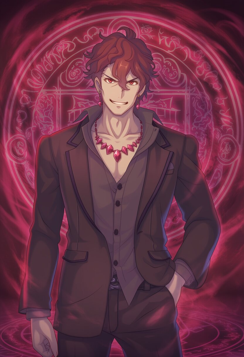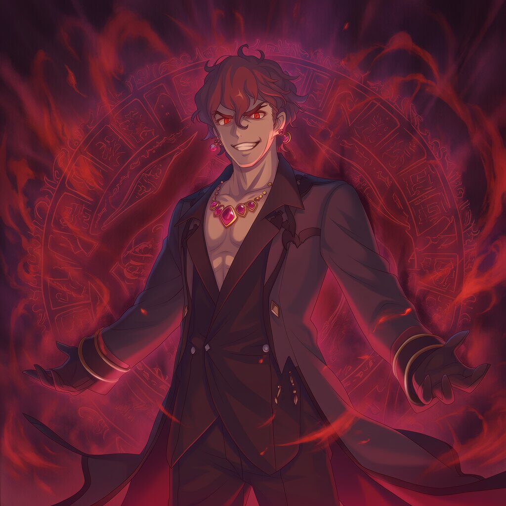 {{{highly detailed}}}, {{official style}}, {{game cg}}, {{intricate}}, {{{male face, male eyebrows, male eyes}}}, {{facial muscle}}, {{bishounen}}, 1boy, solo, {{adult man}}, {{25 year old male}}, {{cygames style, princess connect!}}, 1boy, solo, red eyes, {wavy curly hair}, {{{{{{{{{{very short hair}}}}}}}}}}, dark red hair, hair between eyes, flat chest, cleavage, angry, evil grin, (glare:1.5), v-shaped eyebrows, standing, cowboy shot, {{{ruby earrings, ruby necklace, ruby necklace}}}, {{{background of red glowing magic circle frame}}}, romantic style, light and dark, ruby hair accessory, black suit, red glowing magic circle on the ground, no humans, {{{masterpiece}}}, {{{best quality}}}, {{{very aesthetic}}}, {{{ultra-detailed}}}, {illustration}, {{{extremely detailed}}}, {{{an extremely delicate and beautiful}}}