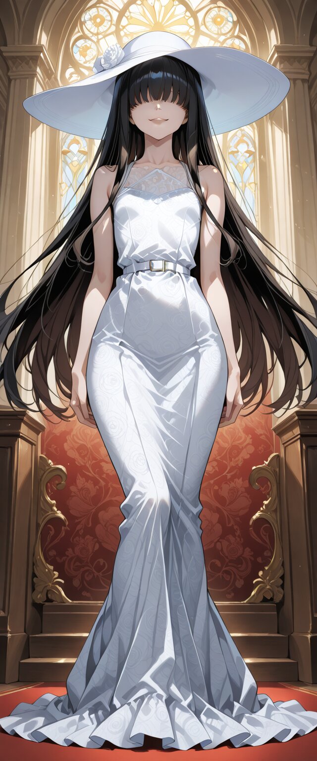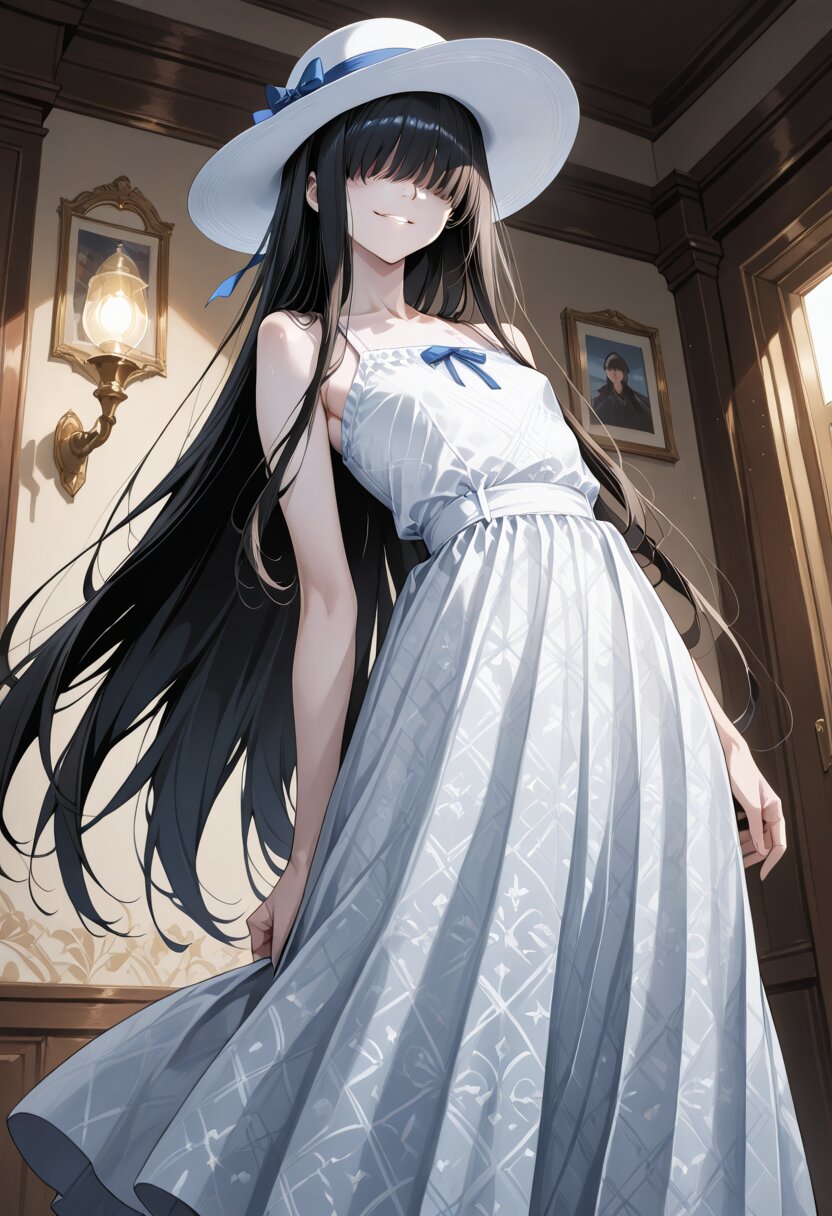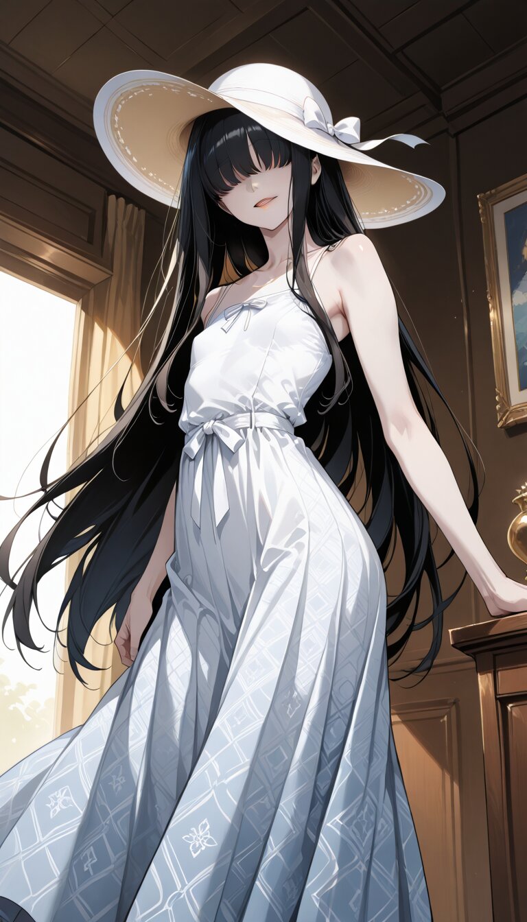 (rating: sensitive:1.2), score_9, score_8_up, score_7_up, score_6_up, NSFW, source_anime, 1girl, hasshaku-sama, tall, black straight hair, very long hair, (bangs over eyes), white summer dress, long skirt, wide brimmed white hat, smirk, from below, diagonal view. lycoris radiata, (fashion illustration, horror, ultra-intricate detailed), flat design, bold colors, patterned fabric, beautiful composition, in the style of cute anime girl. BREAK insanely beautiful and detailed clothes, extremely shiny hair, beautiful small face, kawaii, cute, flat chest, slender, exquisitely delicate pale skin, perfect anatomy, dynamic angle, dynamic pose, BREAK (masterpiece, aesthetic quality, 8K, ultra-detailed), (perfect design, realistic complex), absurdres, highres, hyperrealistic, photorealistic, cinematic lighting,
