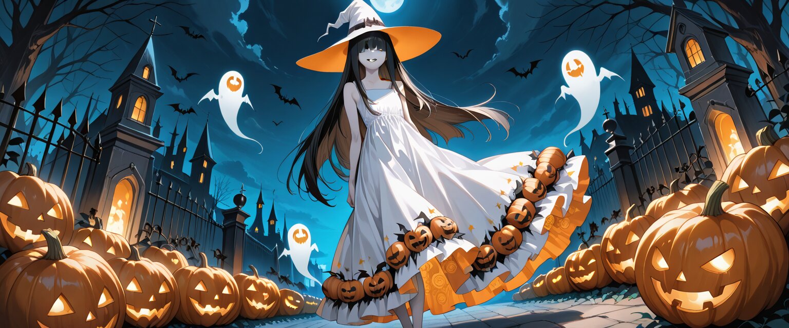 (rating: sensitive:1.2), score_9, score_8_up, score_7_up, score_6_up, NSFW, source_anime, 1girl, hasshaku-sama, tall, black straight hair, very long hair, (bangs over eyes), white summer dress, long skirt, wide brimmed white hat, smirk, (lots of ghost, bats, vampire), cemetery, foggy, haunted castle, (Halloween pumpkins, black pumpkin, night parade, neon yellow eyes), from below, diagonal view. lycoris radiata, (fashion illustration, horror, ultra-intricate detailed), flat design, bold colors, patterned fabric, beautiful composition, in the style of cute anime girl. BREAK insanely beautiful and detailed clothes, extremely shiny hair, beautiful small face, kawaii, cute, flat chest, slender, exquisitely delicate pale skin, perfect anatomy, dynamic angle, dynamic pose, BREAK (masterpiece, aesthetic quality, 8K, ultra-detailed), (perfect design, realistic complex), absurdres, highres, hyperrealistic, photorealistic, cinematic lighting,