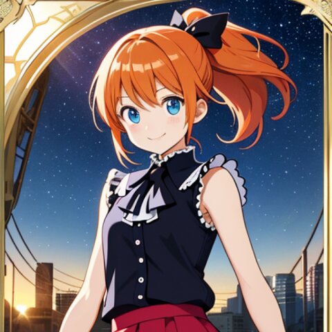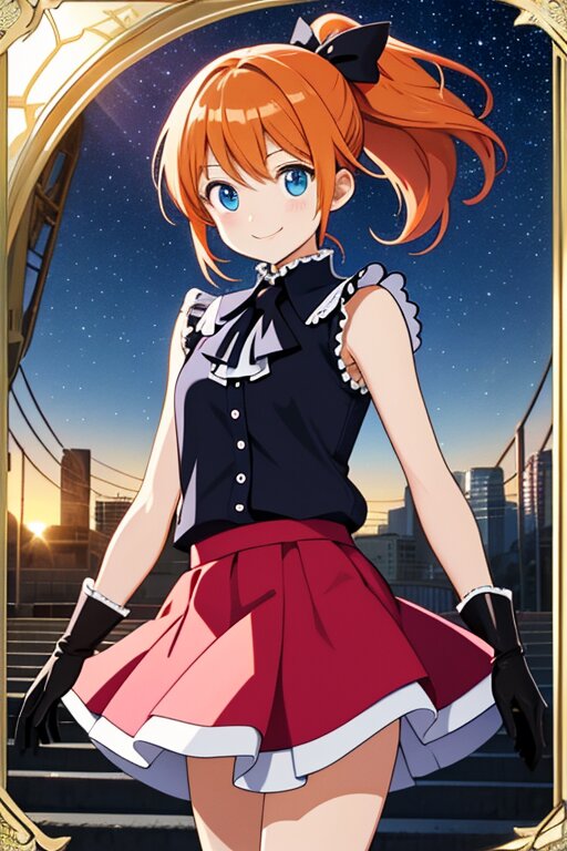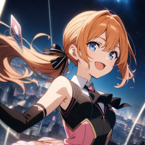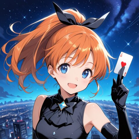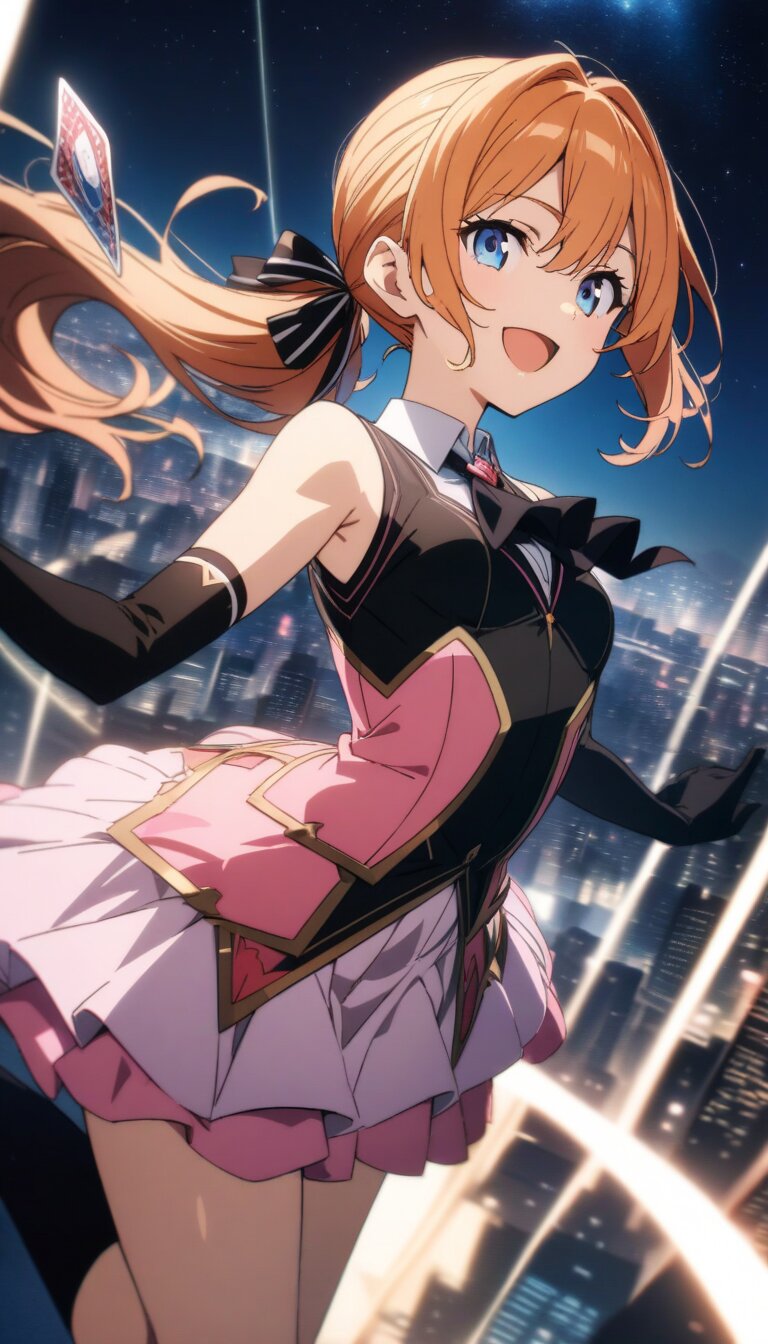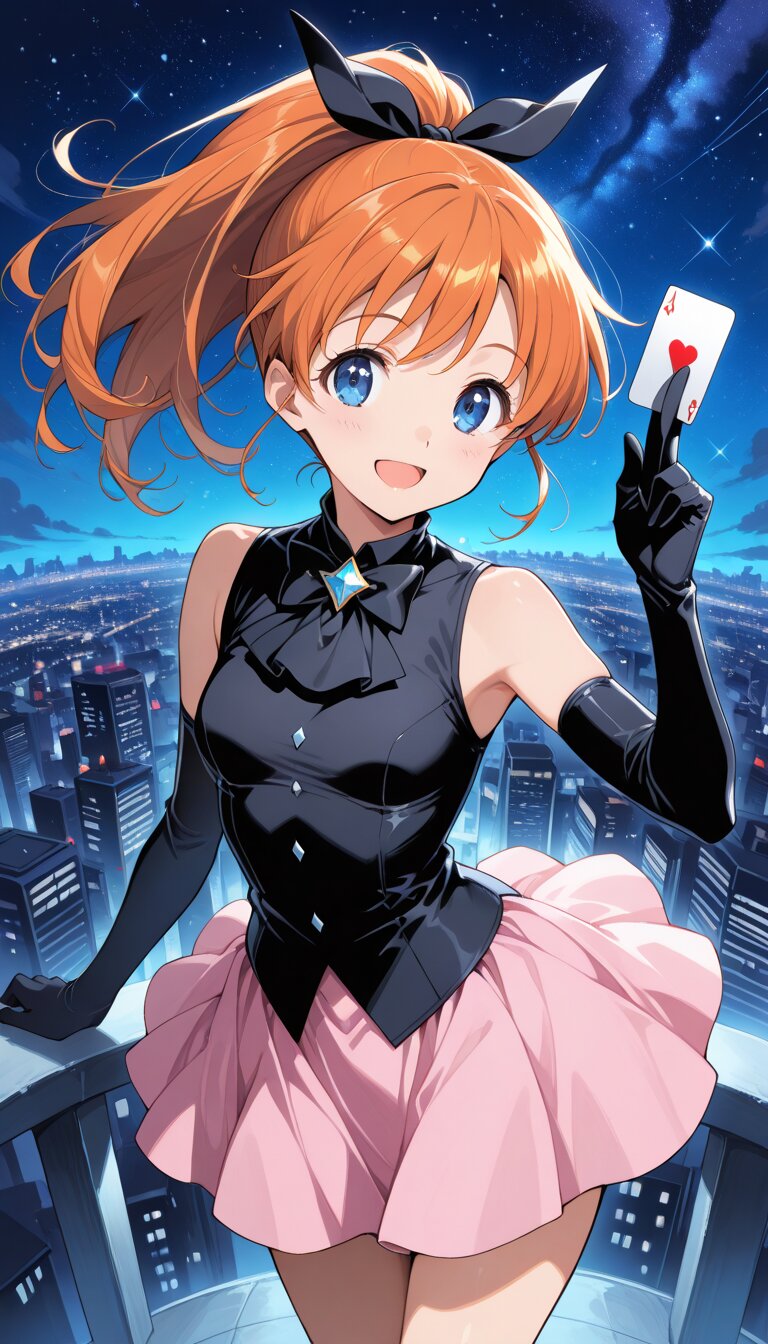 (masterpiece,high resolusion,illustration,ultra detailed 8k art,extremely detailed CG,official art,clothes reflecting light,detailed shiny skin,detailed background:1.3), ((highly detailed beautiful face and eyes)), a beautiful anime girl with beautiful hair standing in front of a starry sky, 1girl, gloves, solo, haneoka meimi, long hair, ponytail, bow, ribbon, blue eyes, orange hair, hair ribbon, small breasts, pink skirt, smile, black gloves, elbow gloves, sleeveless, :d, card, black shirt, holding card, black ascot, looking at viewer, closed mouth, clean, {{scan}}, {{{masterpiece}}}, {{{high quality}}}, {{{animeted}}}, anime colored, {{{official art}}}, perfect body, younger, extreme detail, magical girl, black bowtie, jumping, floating girl, cityscape, night, perspective, perfect anatomy, intricate, (highly detailed),