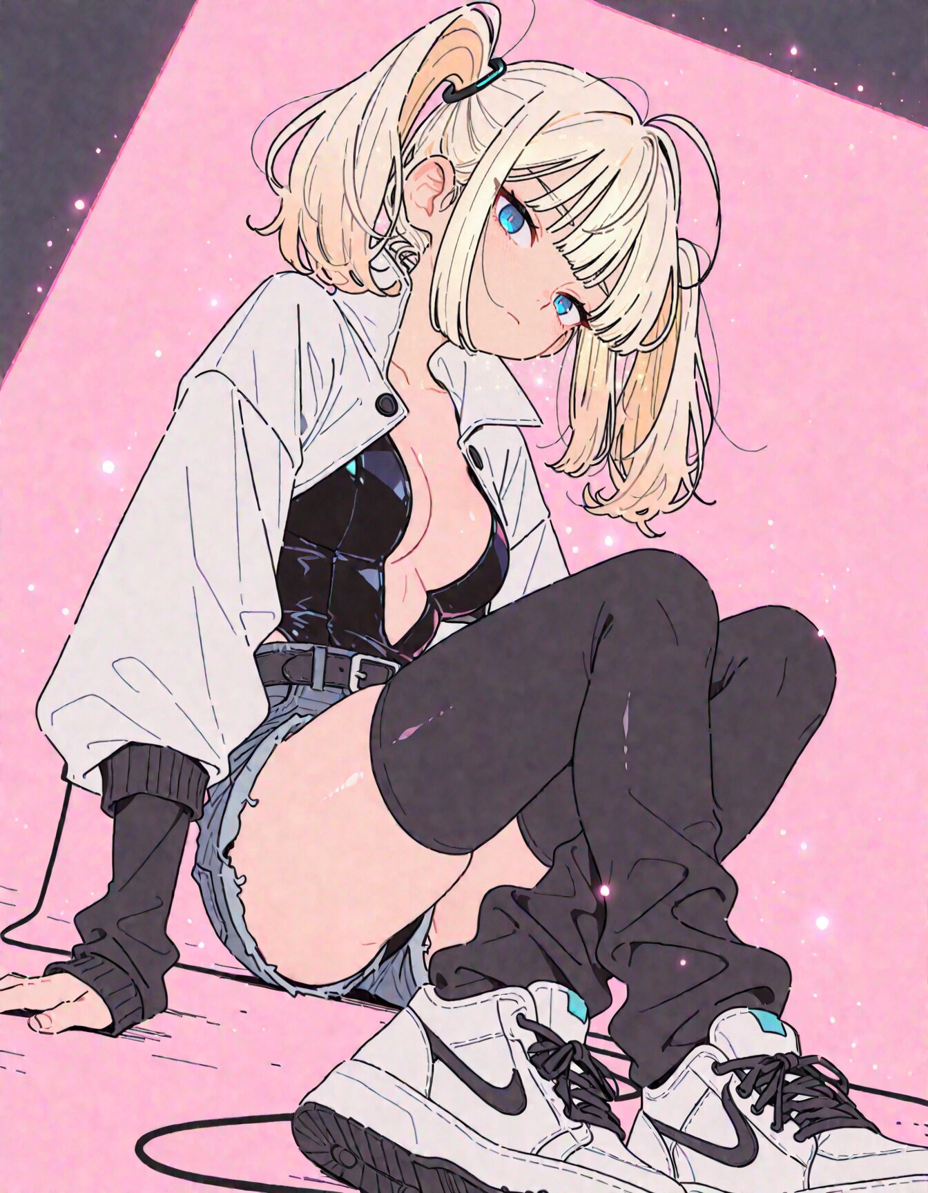 Over the Shoulder Shot, looking back head only from below, looking down dutch angle looking at viewer, 1girl, mature female,, blonde hair, medium hair, messy hair, twin tails, high twin tails, big hair, straight hair, black string hair clip, long bangs, bangs covering eyebrows, long sidelocks, blue eyes, tsurime, sanpaku, black leotard, highleg leotard, leotard bikesuit, center opening, collarbone, cleavage, center boob, boob, white open jacket, cropped jacket, popped collar, three-quarter sleeves, sleeves pushed up, center opening, midriff, black arm warmers. (dark grey shorts:1.1), denim shorts, black belt, (leotard under clothes:1.1), black leg warmers, black thighhighs white sneakers, fetal position, (simple background:1.0), (pink background:1.0), masterpiece, best quality, amazing quality, very aesthetic, absurdres, newest, you can add scenery, (volumetric lighting), To make the background more distinctive. professional art lots of details, , overexposure, shiny-glistening, (watercolor style:0.0), (pastel color style:1.0) 4ur4_illu,shiny, glowing, glowing particles, glowing light particles, light particles, <lora:noline (1):-0.5> <lora:sdxl2-flat2-512b:0.0> <lora:facelightup_xl_v10:0.5> <lora:V2_yakumo_alchemy:0.5> <lora:Aura_illu:0.1>