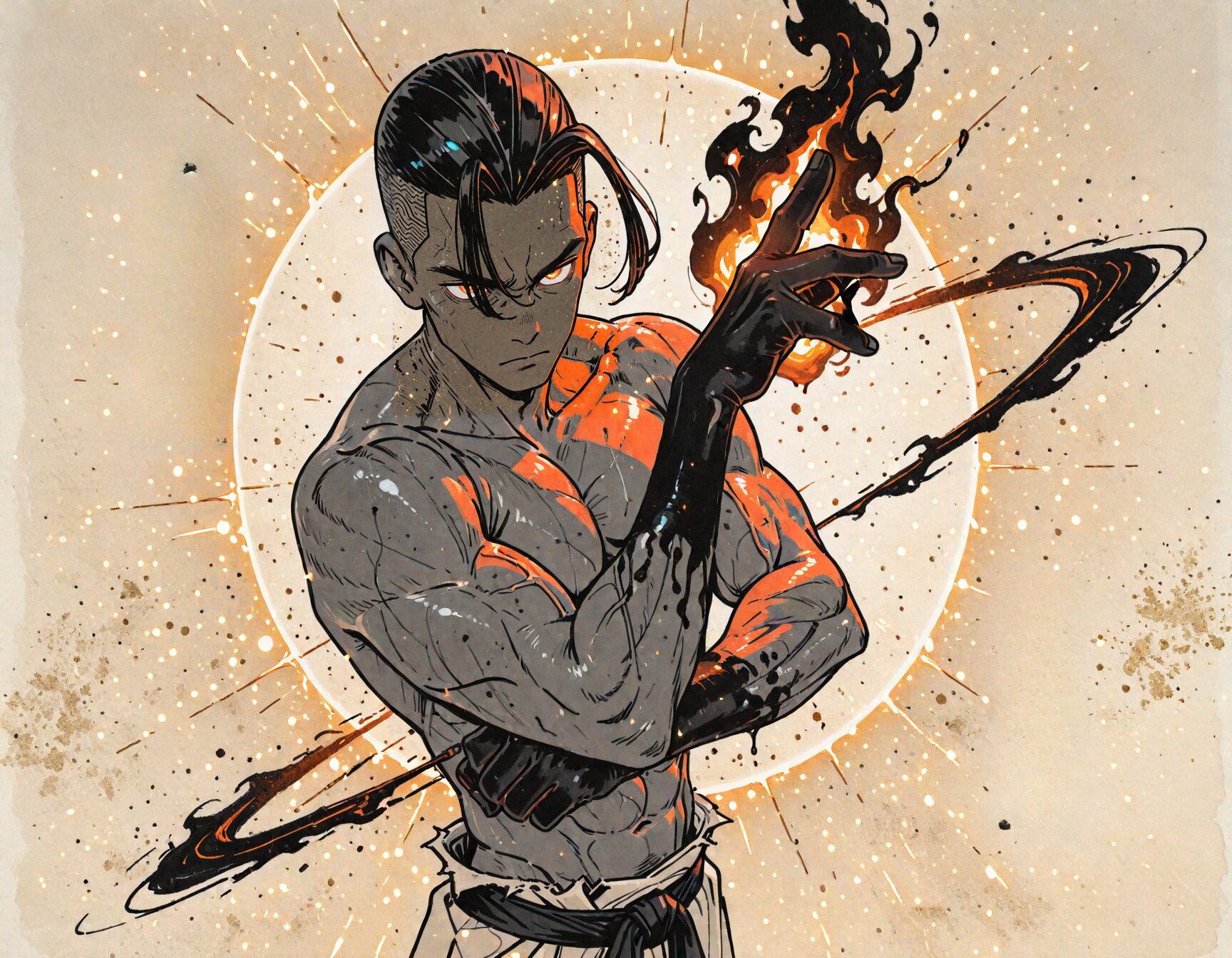 (close up:1.2) (from above,looking up:1.0) paper background, sumi-e, faux traditional media, color ink \(medium\), painting \(medium\), calligraphy brush (medium), , spot color, 1boy, ikemen, handsome, muscular male, abs, biceps, large pectorals, crew cut, curtained hair, skinny hair, stylish, cackle, arm under breasts, dynamic pose, kung fu attack, kung fu pose, kung fu action, ink wash effect, An illustration with line art drawn using a brush, featuring dynamic movement lines expressed with thick sumi ink strokes. super fine concept art, hard surface, 8K, unreal engine, masterpiece, best quality, amazing quality, very aesthetic, absurdres, you can add scenery, (volumetric lighting), To make the background more distinctive. professional art lots of details, , overexposure, sumie effect style, 4ur4_illu,shiny, glowing, glowing particles, glowing light particles, light particles, brown flame, <lora:noline (1):-0.5> <lora:sdxl2-flat2-512b:-0.2> <lora:facelightup_xl_v10:0.5> <lora:V2_yakumo_alchemy:0.5> <lora:Aura_illu:0.1>