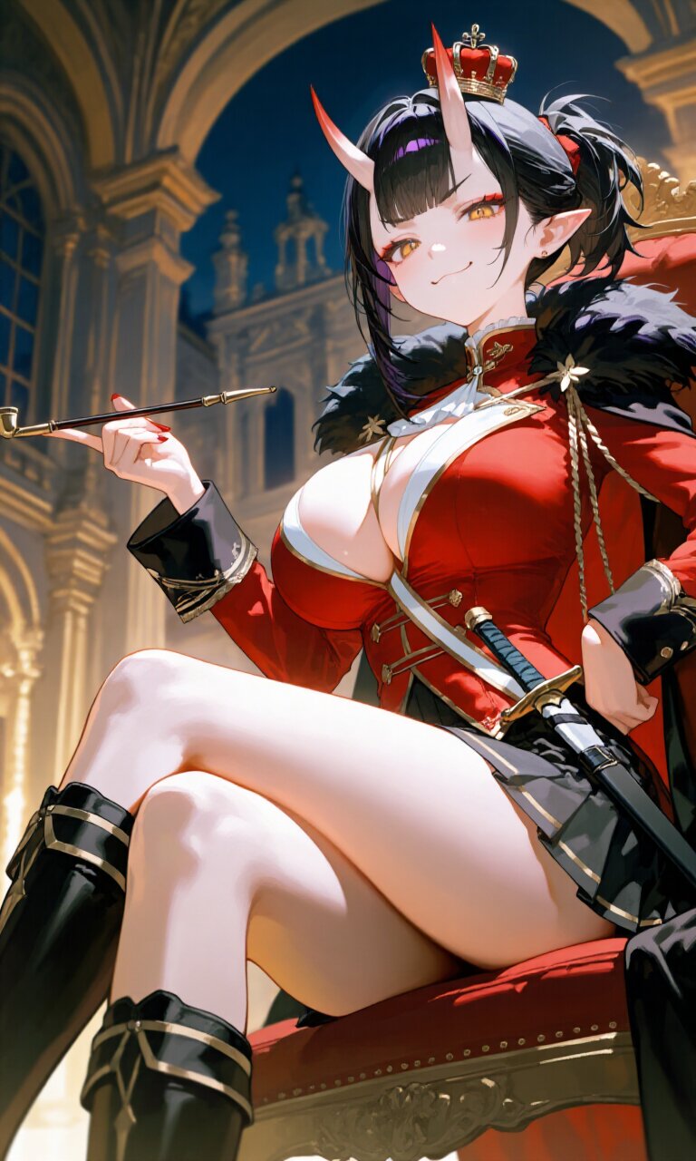 A young woman with a childish yet smug expression sits on a luxurious chair in a grand palace, viewed from a low cinematic angle. She has black hair with subtle purple undertones, styled in a short ponytail with blunt bangs, and a pair of small oni horns on her forehead. Her V-shaped brows and slanted yellow eyes give her a mischievous charm. She wears a striking red prince costume with long sleeves, a black luxurious cape, and a mini skirt, accessorized with a crown and a dagger at her waist. Her figure is slender with big breasts, a narrow waist, and petite hips, with thin thighs and legs crossed elegantly. She holds a kiseru (Japanese smoking pipe) in one hand, exuding confidence. The palace features intricate Rococo architecture with gilded details, illuminated by soft lighting that enhances the romantic night atmosphere. The illustration is highly detailed, with outstanding intricacies in textures, fabrics, and ambient lighting, creating a mood of refined elegance.