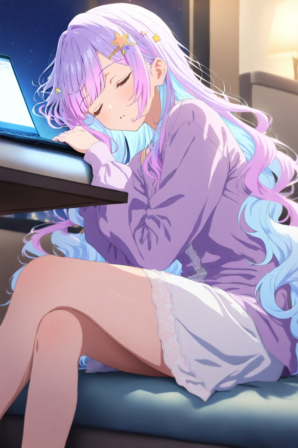 1 girl, sleeping, night, laptop on table, soft anime face, teenage, pastel purple hair, (light blue inner hair:1.5), fluffy long hair, loosely wavy hair, soft flowing hair, straight-cut bangs, star-shaped hairpin, calm violet eyes,