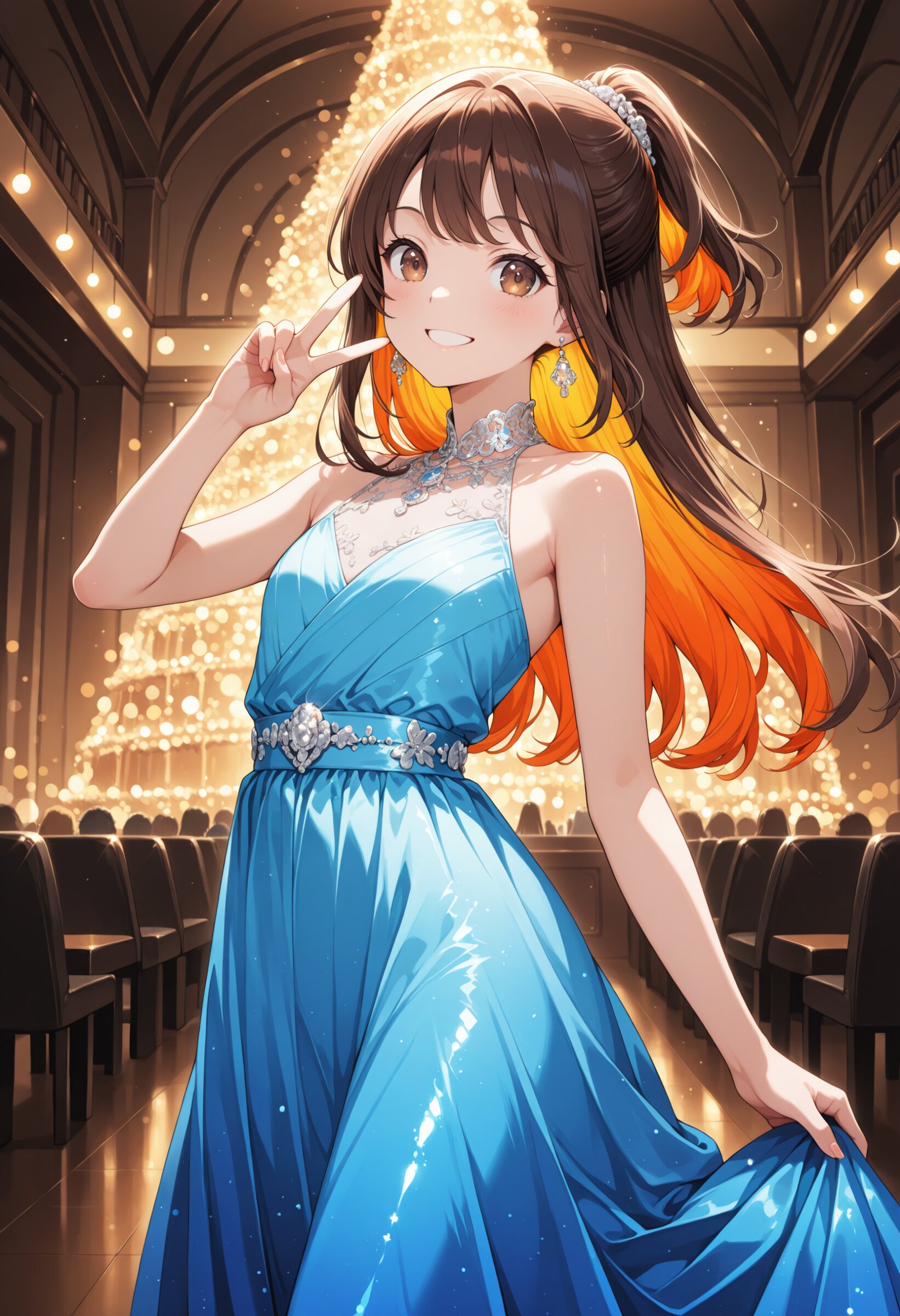 (masterpiece, best quality, ultra-detailed, intricate details, anime style, 8k illustration, vibrant colors, shine colorful), 1 little girl, solo, brown long hair with orange inner hair, (long hair:1.2), short ponytail, brown eyes, smile, cheerful, formal elegant dress, elegant mermaid-style long skirt, layered tulle fabric, holding up a peace sign close to her face, indoors, party venue, blurred bokeh background, diagonal angle