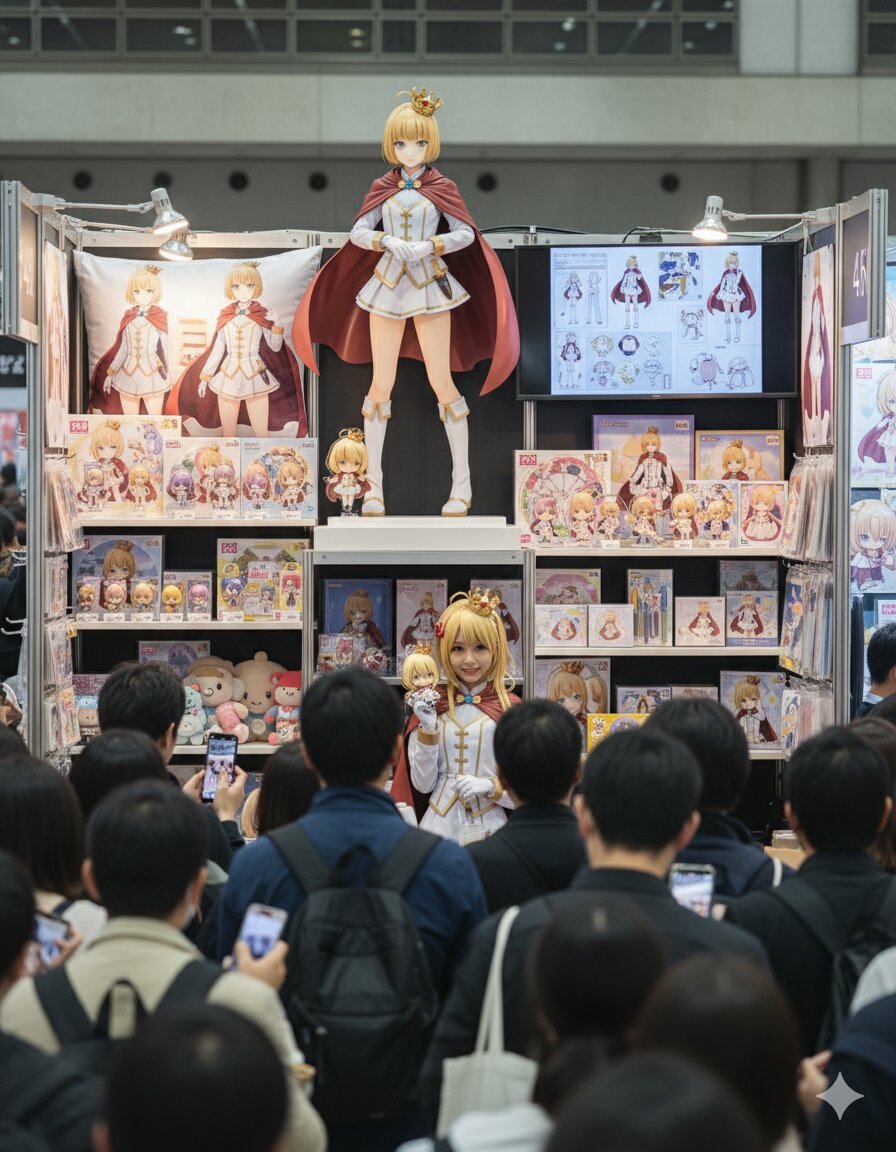 Erase the background and replace the characters with the following: Cosplayers and Character Goods Character/Motif: Character goods based on the illustration Hairstyle, Eyes, and Appearance: (Focus on merchandise, not the character itself.) Main Character: A cosplayer is holding a figurine in the center of the screen. Location: Comic Market (a doujinshi sales event). A spacious booth is filled with merchandise lined up on tables and shelves. The atmosphere is filled with excitement and anticipation. Merchandise Lineup: • A large, approximately 100cm figure is displayed in the center of the booth, creating an eye-catching display. • The character is displayed on an 80-inch LCD panel. • Acrylic Stands • Chibi Figures (Deformed) • Body Pillows (Large, Full-Length Character Print) • Jigsaw Puzzles (Using Character Artwork) • Stationery (Notebooks, Pens, Clear Files, etc.) • Desk Pads • Plush Toys (Deformed) Exhibition/Display: • Goods neatly arranged throughout the booth, creating a unified look. • Utilizing desks and shelves reminiscent of doujinshi sales events, the layout encourages fans to pick up items. • With the energy of the visitors as a backdrop, the venue is presented as a special "fan sanctuary." Overall Tone: A dreamlike sales space. While emphasizing cuteness and pop, the space evokes the unique enthusiasm of doujin events and the feeling of a "sanctuary for fan activities." Swarms of people. Image Quality: Photorealistic, 4K (4000px x 3000px)