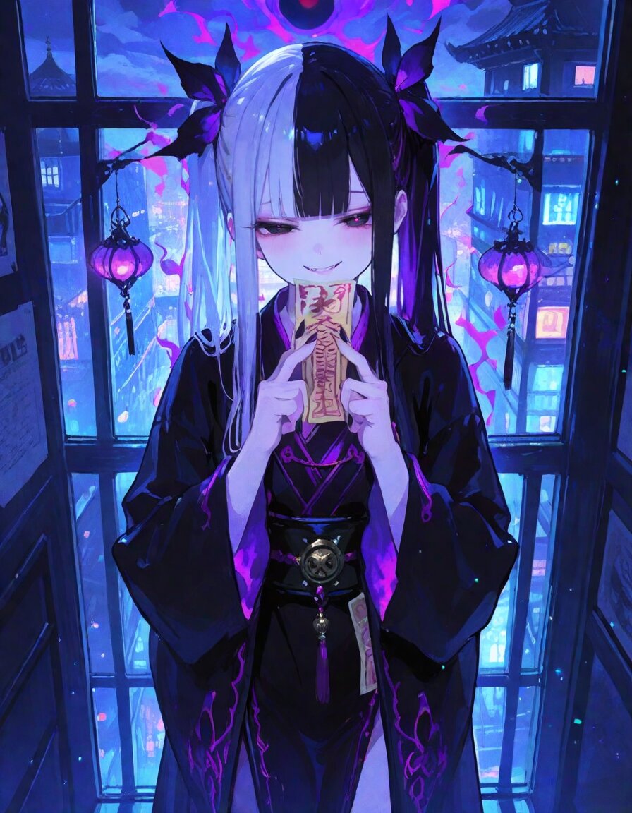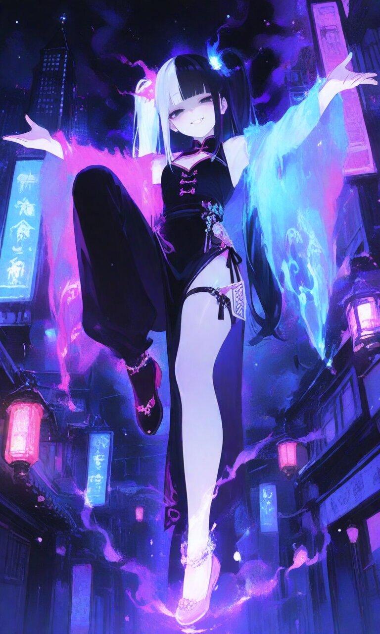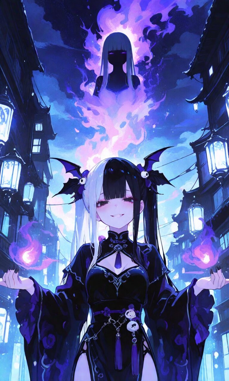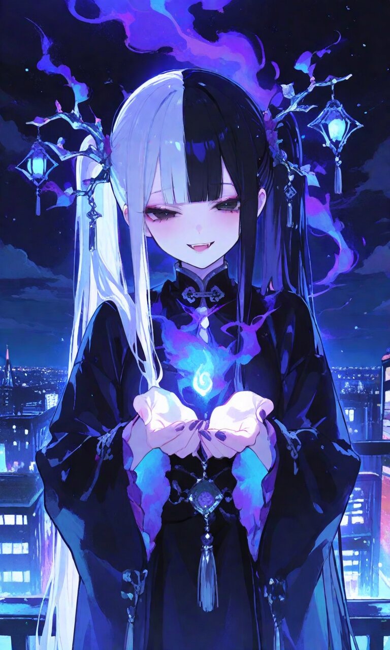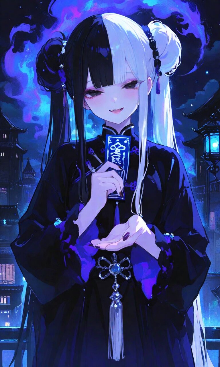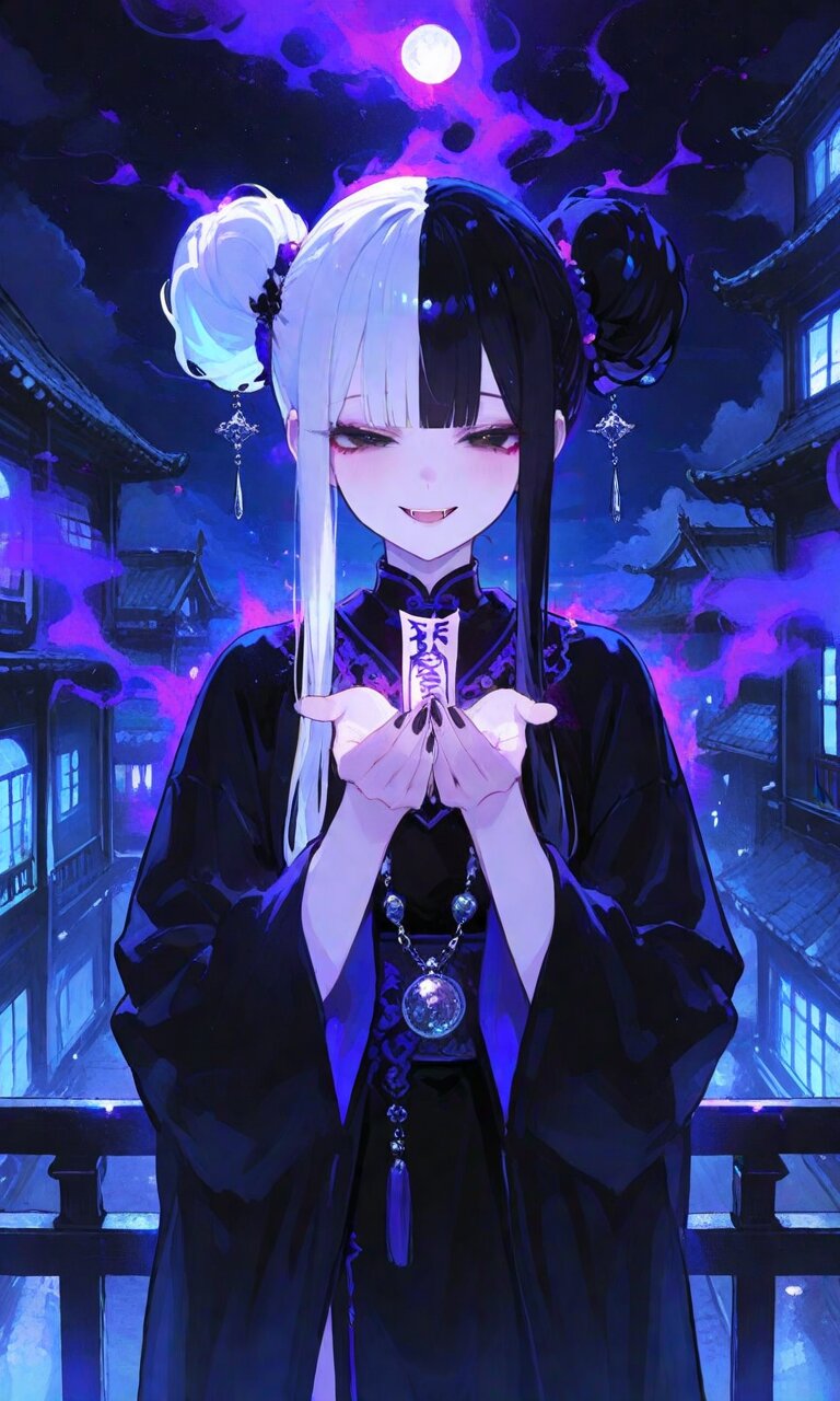 1girl, solo, kyonshee outfit, traditional chinese clothes, elegant hopping vampire, detailed night city background, glowing lanterns in deep red and violet tones, misty atmosphere, chinese rooftops in the distance, ethereal aura, blunt bangs, twintail, black eyes, (((split-color hair))), (((two-tone hair))), (black hair), (silver hair), talisman paper charm attached to forehead, glowing talisman, looking at viewer, cowboy shot, seductive mysterious expression, half-closed eyes, faint alluring smile, graceful pose with hands raised as if casting an enchantment, cinematic perspective, moonlight casting cold pale blue light on her silhouette, glowing red and purple mist swirling around, shimmering particles in the air, delicate embroidered silk with subtle shine, ornate jewelry reflecting colored light, dramatic contrast of cold moonlight and warm red-violet glow, masterpiece, best quality, ultra-detailed illustration, sharp focus, rich atmosphere, vertical orientation, poster-style artwork, mystical and alluring mood