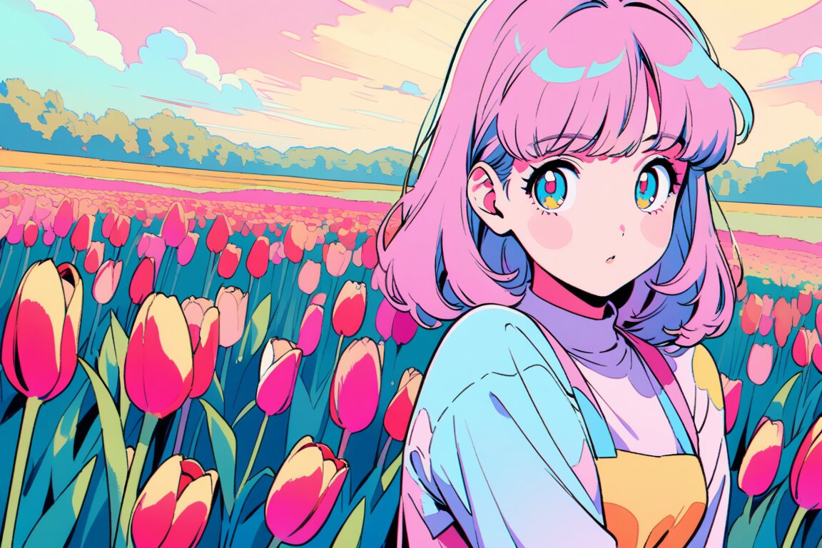masterpiece, best quality, beautiful detailed eyes, ultra-detailed, finely detail, highres, perfect anatomy, colorful, pastel colors, 1girl, solo, retro style, kawaii illustration, (1980s city pop art style), (1980s art style), city pop anime, Kyoto Animation, 1980s fashion, fine, (tulip field), park, shirt, skirt, full body
