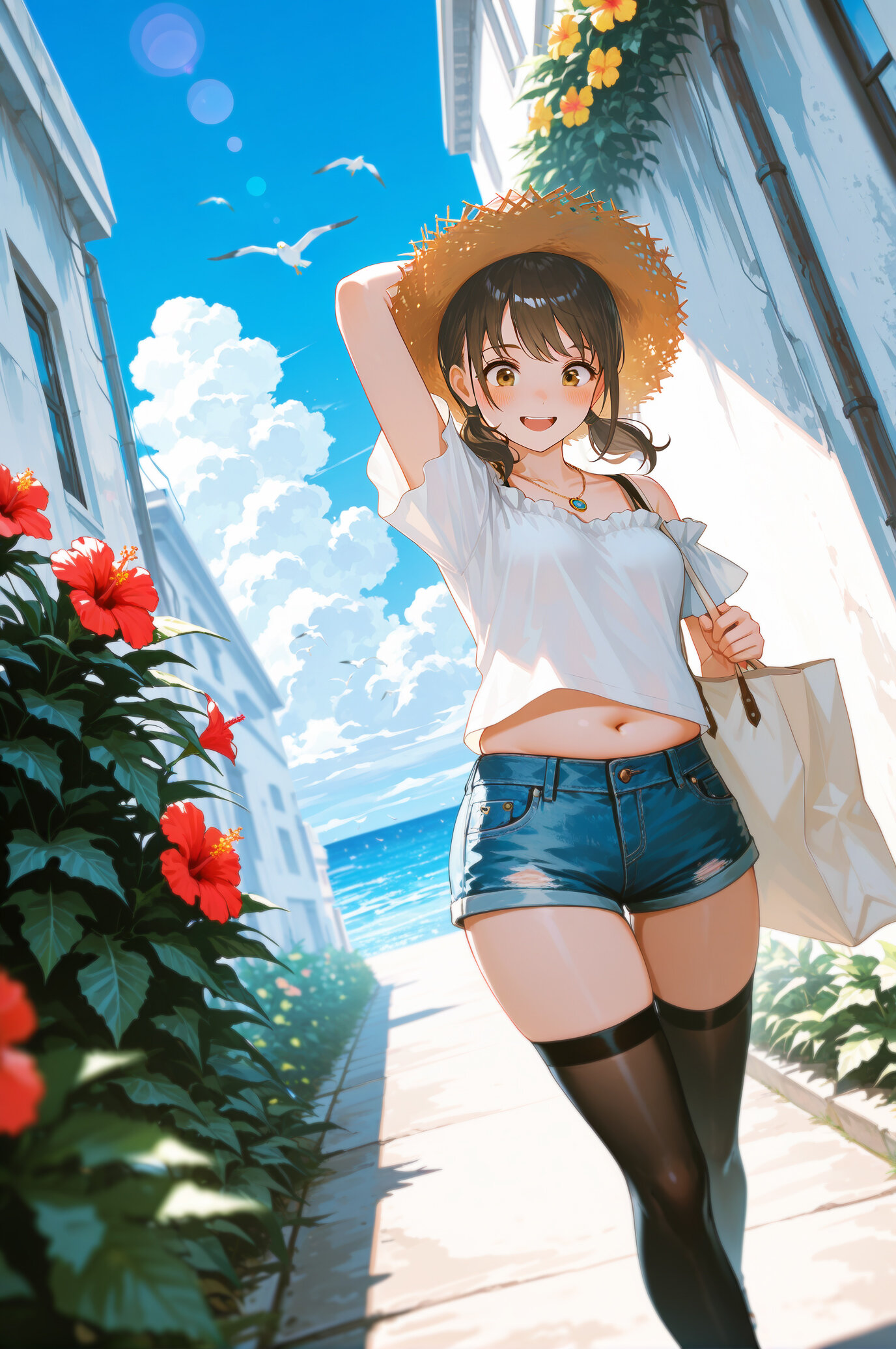 ヘソ出し、デニムショーパンというアクティブな出で立ちで、夏のリゾート地を散歩する花凛ちゃんを生成してみました!(*´▽`*)