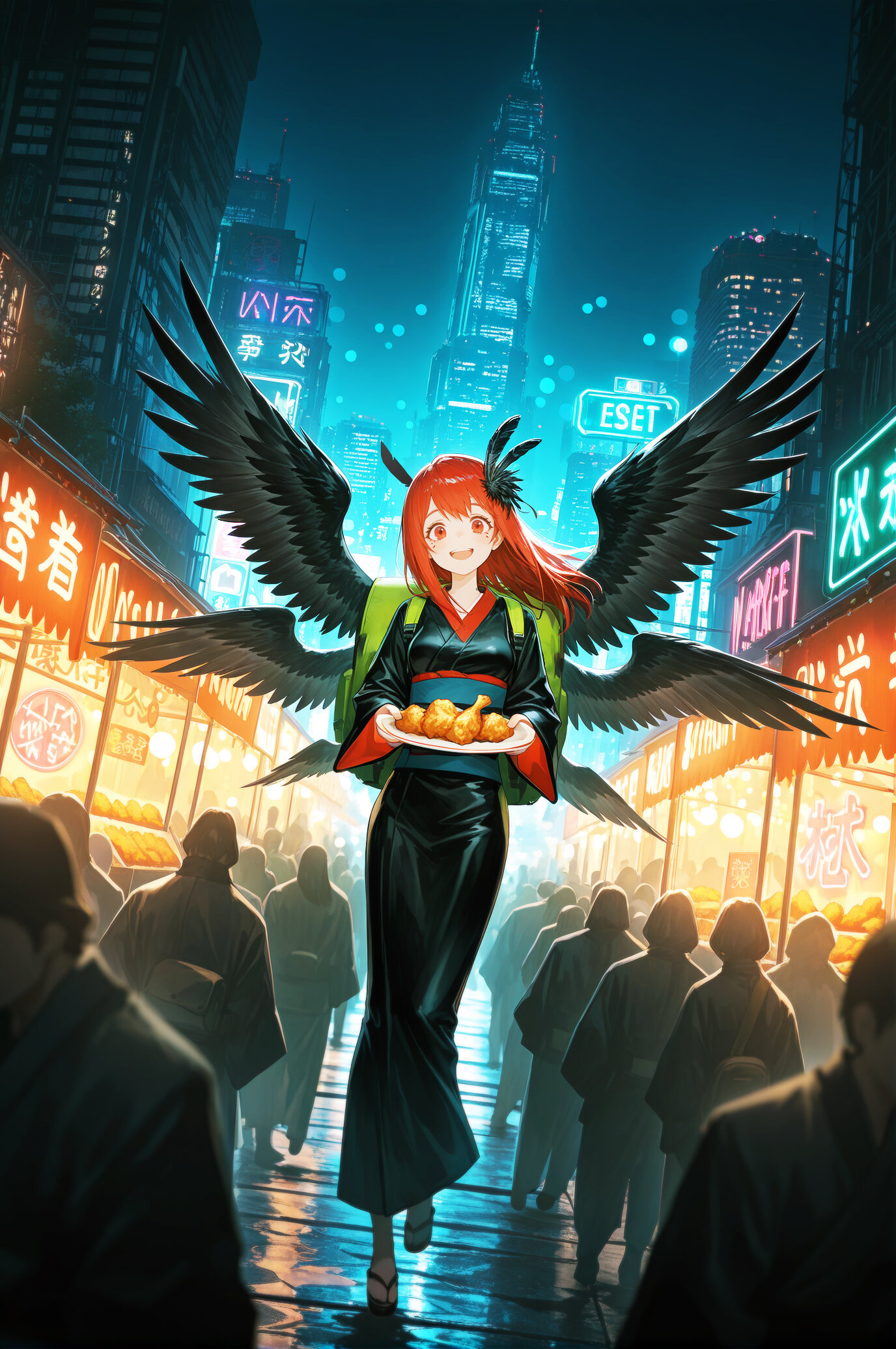 「唐揚げ専門店のフードデリバリー」という天職を見つけた八咫烏ちゃんをイメージして生成してみました(*´▽`*)