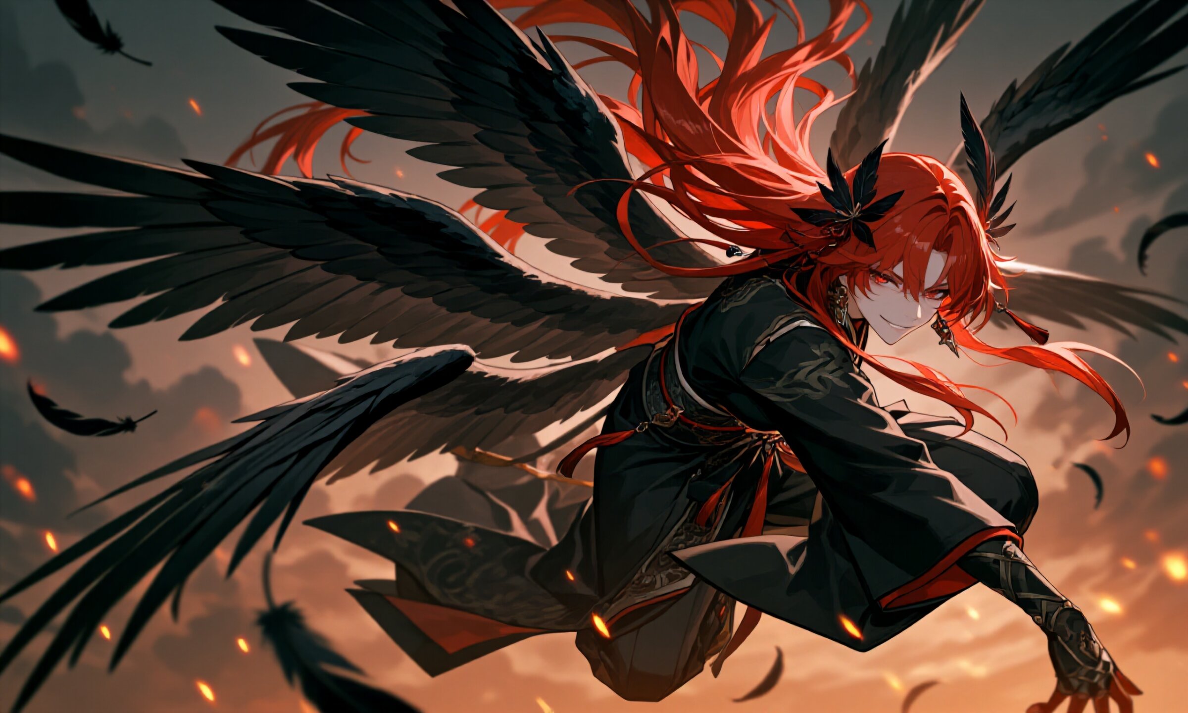 (masterpiece, best quality, ultra-detailed, anime style, dramatic lighting, mystical atmosphere), 1girl, cute, red long hair, red eyes, black kimono with intricate patterns, feather ornaments in her hair, large black crow wings on her back (black wings:1.2) (multiple wings:1.8) (six wings:1.7) (crossroad wings:1.2), crow feathers swirling around, mysterious smile, upper body, dynamic battle pose mid-air, ready-to-strike stance, (leaning forward:0.8), bent arm, bent leg, dusk, glowing embers in the air, dark sky, divine aura, dynamic high angle, diagonal angle