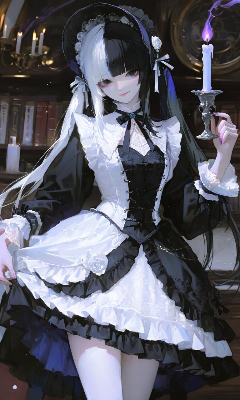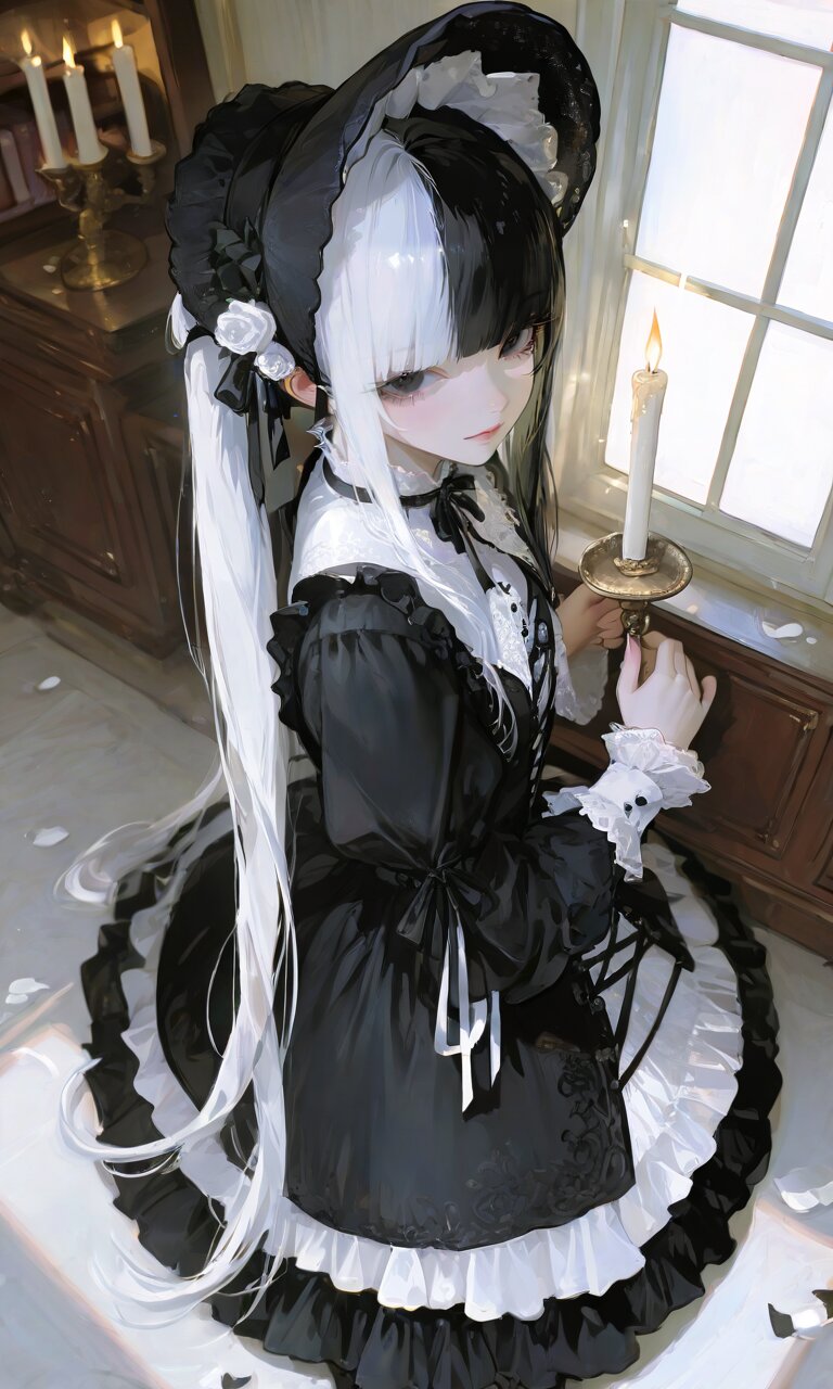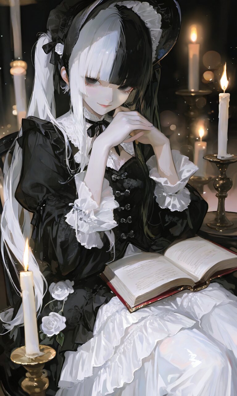 1girl, solo, blunt bangs, twintail, split-color hair, two-tone hair, black hair, silver hair, black eyes, wearing an elegant black and white gothic lolita dress, black dress with white lace overskirt, tiered skirt, ruffled cuffs, black bonnet with white ribbons, holding a delicate white rose, sitting in vintage study, holding an open book, gentle dreamy smile, eyes slightly lowered, relaxed pose, soft warm sunset light mixed with candle glow, bokeh background, floating light particles, intricate lace and fabric details, photorealistic, high detail, vertical 3:5 aspect ratio, eye-catching, Instagram-style, visually striking, ultra-detailed, highly detailed eyes, realistic hair strands, soft flowing twintails, sharp focus, photorealistic skin, realistic shadows and lighting, cinematic composition, subtle depth of field, realistic reflections on accessories, volumetric lighting, high-resolution textures, fine embroidery, delicate rose petals, natural skin tones, realistic fabric folds, elegant posture, ambient light glow, 8k quality, masterpiece