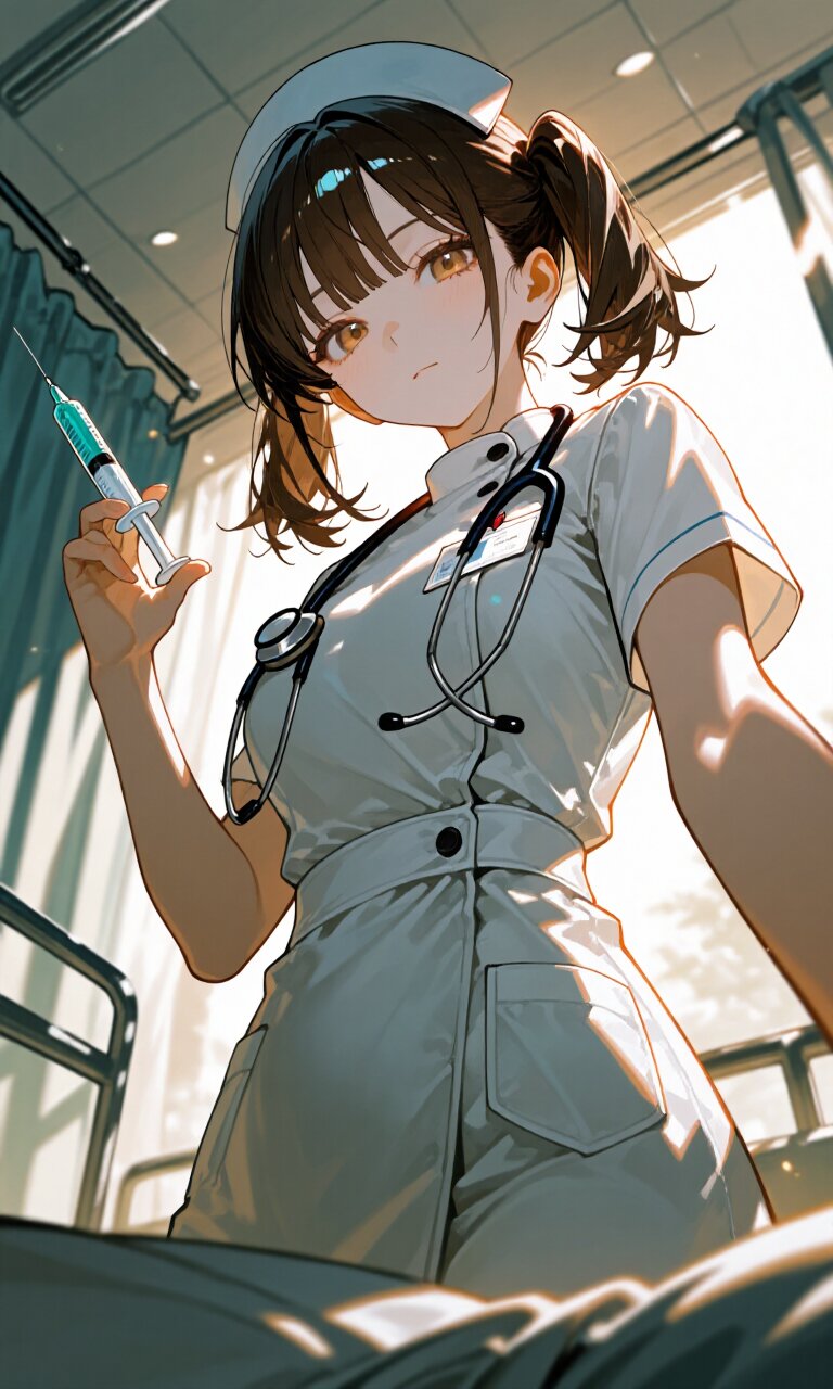 A young female nurse with short, brown twintail hair stands in a sunlit hospital bedroom, looking down at the viewer with an intelligent yet expressionless gaze. She wears a traditional nurse uniform with a crisp white dress, a nurse cap, and a stethoscope around her neck. A name tag is pinned to her chest, adding to the professional atmosphere. In one hand, she holds a large syringe, its polished surface reflecting the soft lighting. The sunlight streams through a nearby window, casting a warm glow on her shiny hair and the pristine hospital environment. The background is softly blurred, emphasizing the nurse in sharp focus. The atmosphere is calm and clinical, with a slight chill in the air, yet the sunlight and soft lighting create a soothing contrast. The style is detailed anime, with attention to textures like the fabric of her uniform and the metallic sheen of medical equipment.