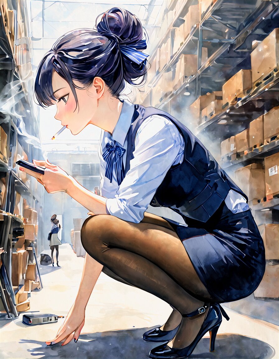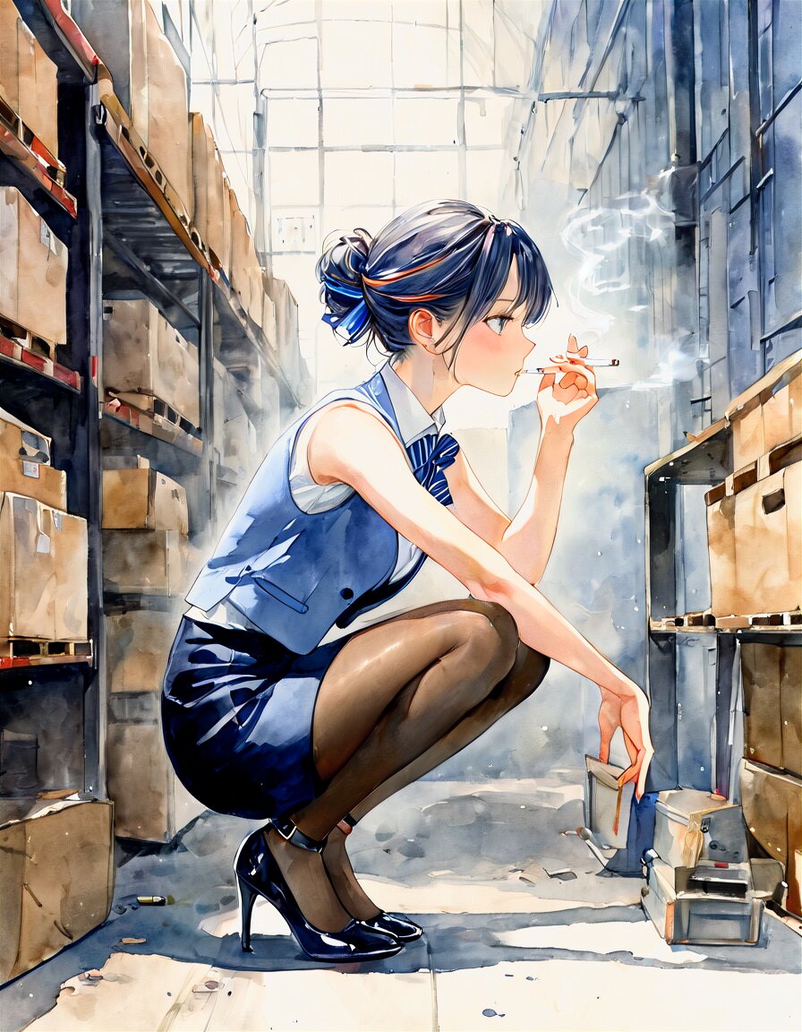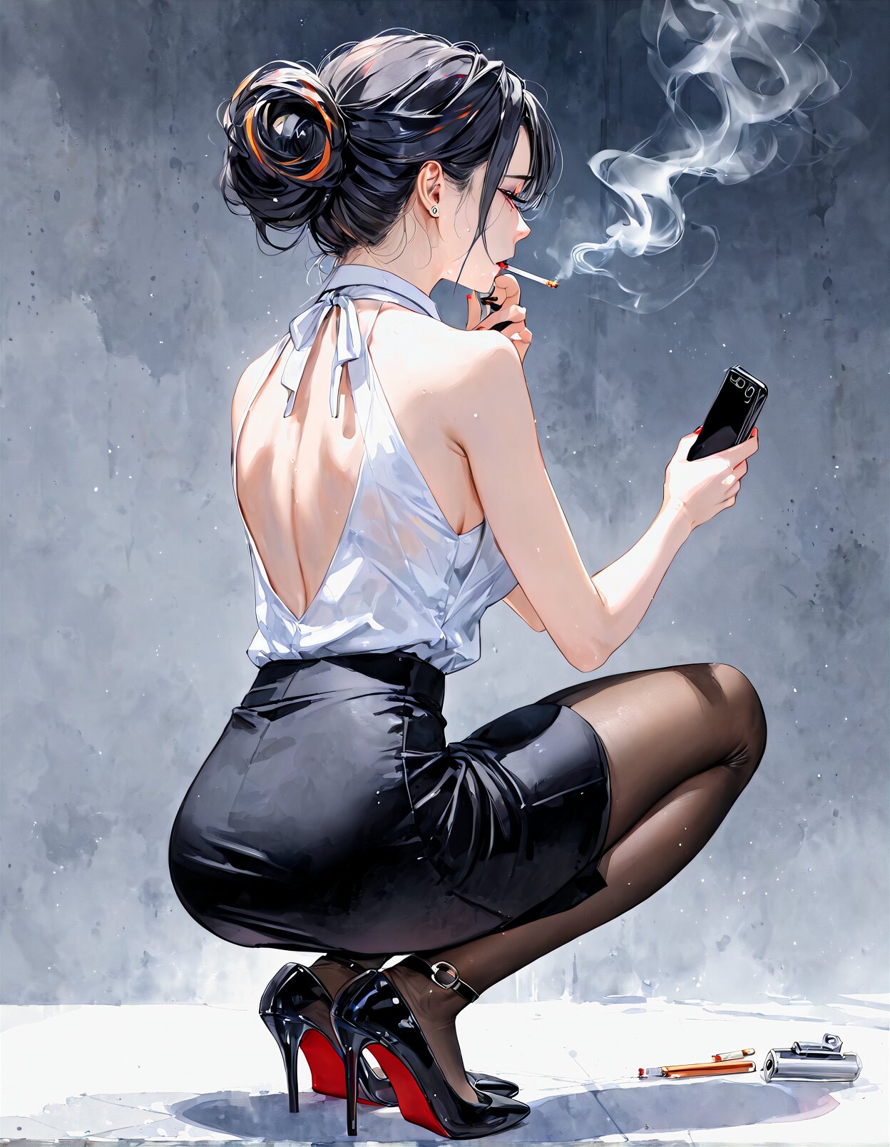 perfect anatomy, watercolour, 1girl, pantyhose, squatting, crying, halter neck collared shirt, pencil skirt, streaked hair, dark, black ankle strap pin heels, updo, alloy, from behind, smoking, smoking cigarette, sleeveless, makeup, looking phone,