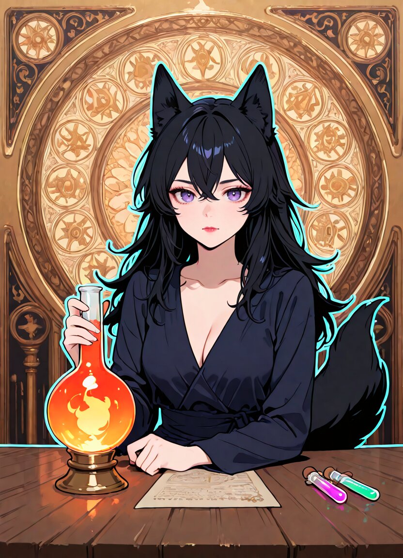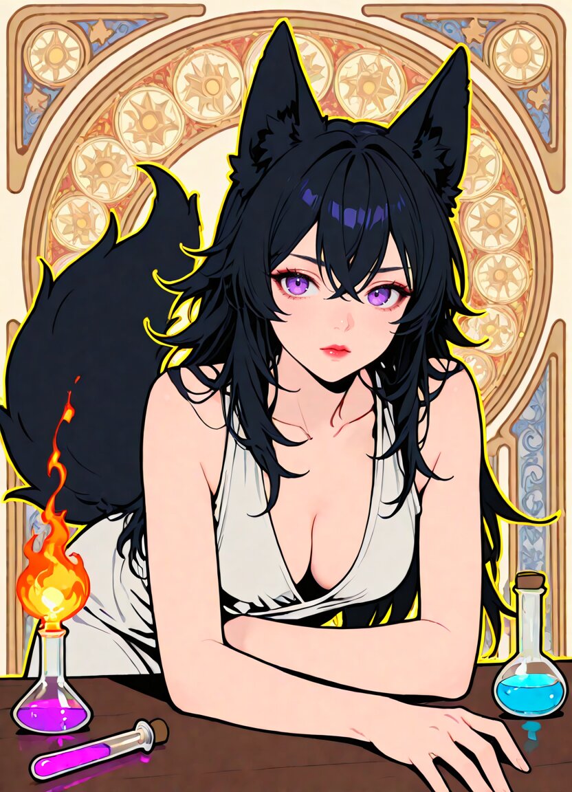 general,vibrant,(vector outline, flat color:1.5),art nouveau,volumetric lighting,Attention to detail,Movie Scenes,detailed background,detailed foreground, BREAK 1girl,solo,against table,flask,test tube,ancient magician,ancient rome, 20yo,slender,cool-face,medium breasts,cleavage,black hair,long hair,crossed bangs,purple eyes,long_eyelashes,lipstick,wolf ears,black wolf tail, magic,fireball,, appropriate posture,appropriate configuration,ideal ratio body proportions,perfect anatomy, <lora:Fixhands_anime_bdsqlsz_V1:1>, masterpiece,best quality,newest,absurdres,highres,ultra high res,8K UHD,hyper-detailed,