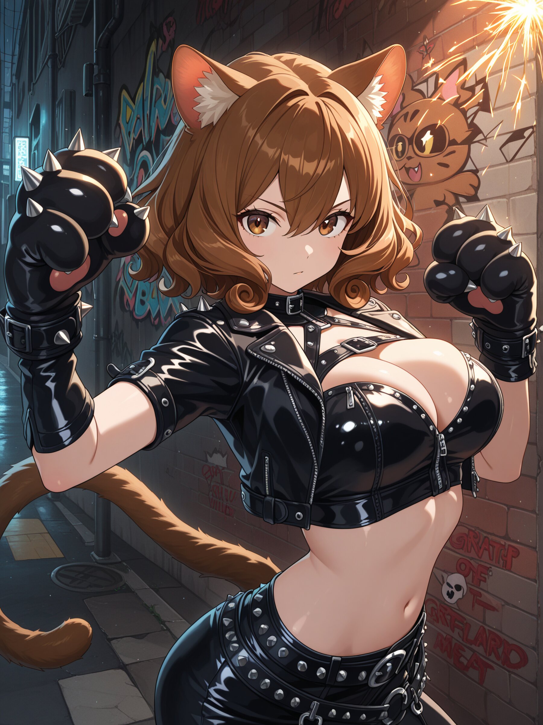 (masterpiece, best quality, ultra-detailed, intricate details, anime style, 8k illustration), 1girl, brown cat ears, brown eyes, chestnut brown wavy bob hair, hair between eyes, loose inward curls, natural cat tail, large breasts, upper body, dynamic battle stance, bent arms, bent legs, wearing black leather spiked paw gloves, clenched fists, cropped combat top and short jacket, leather belts, sporty yet wild outfit, background of back alley with graffiti walls, rainy street with puddles reflecting lights, feathers and sparks swirling around
