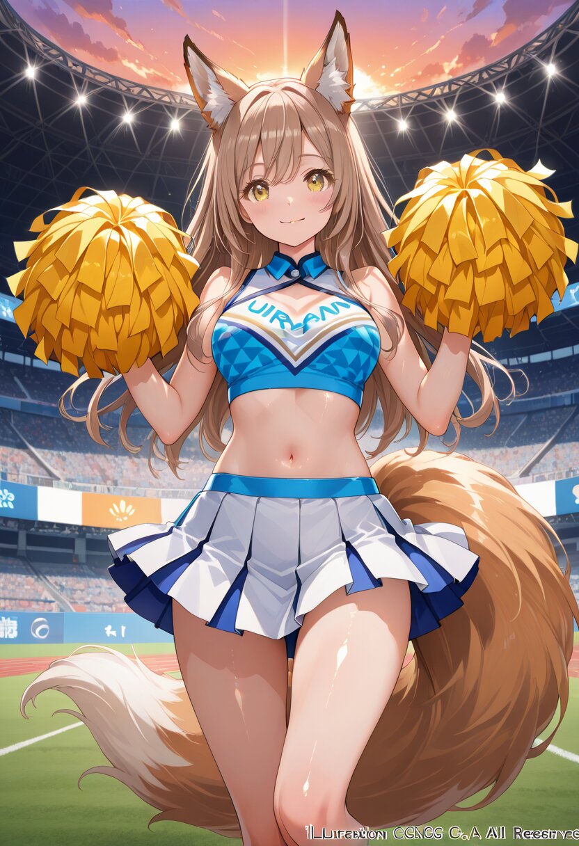 (masterpiece,high resolusion,illustration,ultra detailed 8k art,extremely detailed CG,official art,clothes reflecting light,detailed shiny skin,detailed background:1.3), ((highly detailed beautiful face and eyes),anime style, fox ears girl, light brown hair, long hair, double eyelids, long eyelashes, fluffy tail, cheerful expression, energetic pose, friday cheerleader outfit, pleated skirt, pom-poms, stadium background, sunset lighting, weekend mood, vibrant colors, fantasy realism, cinematic composition, ultra-detailed, masterpiece