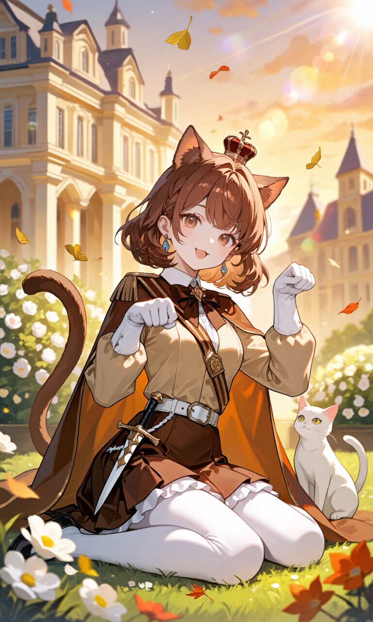 A beautiful anime-style girl with chestnut brown wavy bob hair and delicate facial features sits gracefully on the ground in a lush flower garden during golden hour. She has soft brown cat ears and a natural brown tail, adding a playful charm to her appearance. Her outfit is a luxurious beige Prince Charming costume with a chocolate-colored cape, a brown mini skirt, white tights, and elegant white gloves. A small crown rests atop her head, and a decorative dagger hangs at her waist. Her expressive brown eyes sparkle with intelligence and joy as she smiles with an open mouth, making a cute ":3" expression. She strikes a playful "paw pose" while a white cat sits beside her. The background features neoclassical palace architecture bathed in warm sunlight, with blooming flowers, falling autumn leaves, and a dreamy romantic academia atmosphere. Soft lens flare and golden-hour lighting enhance the scene's magical, happy mood. The artwork is insanely detailed, with masterful rendering of textures in her costume, jewelry, and the surrounding environment.