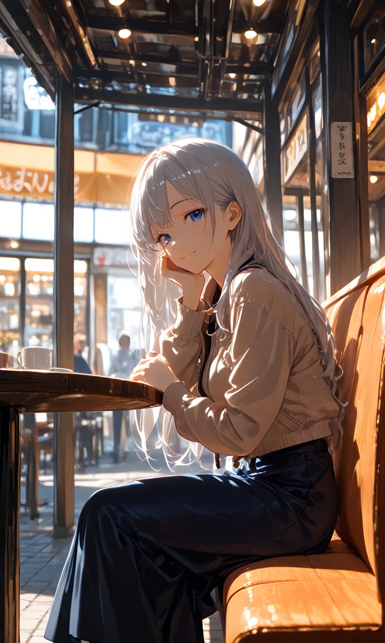 (best quality),(masterpiece),(ultra detailed),1 lady, long hair, silver hair, blue eyes, jacket, long skirt, , restaurant, streetn sitting, smile, side view