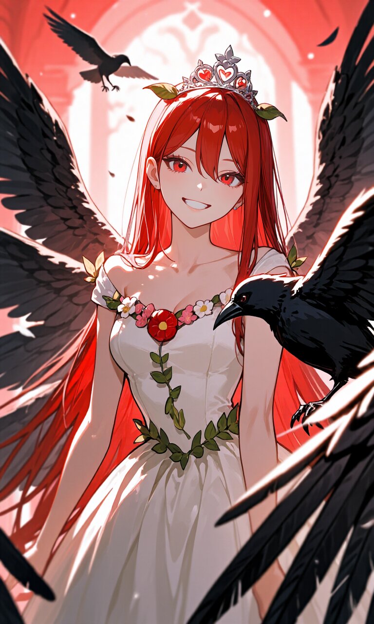 A stunning anime-style illustration of a radiant woman with long, straight red hair parted between her eyes, framing her delicate facial features and vivid red eyes. She stands gracefully with six magnificent black crow-like wings spread behind her—some feathered like ravens, others with an intricate crossroad pattern—creating a dramatic silhouette. Her outfit is a whimsical Clanberry Shortcake-inspired princess dress, adorned with leaf and flower decorations and a Clanberry-shaped tiara, exuding fairy academia charm. The background is a soft gradient of red hues with subtle bloom effects, enhancing the light fantasy atmosphere. She gazes directly at the viewer with a cheerful grin, her skin and wings rendered in hyperrealistic detail under soft lighting. The scene evokes a dreamy, ethereal quality, as if she’s standing before a Clanberry palace, radiating joy and elegance.