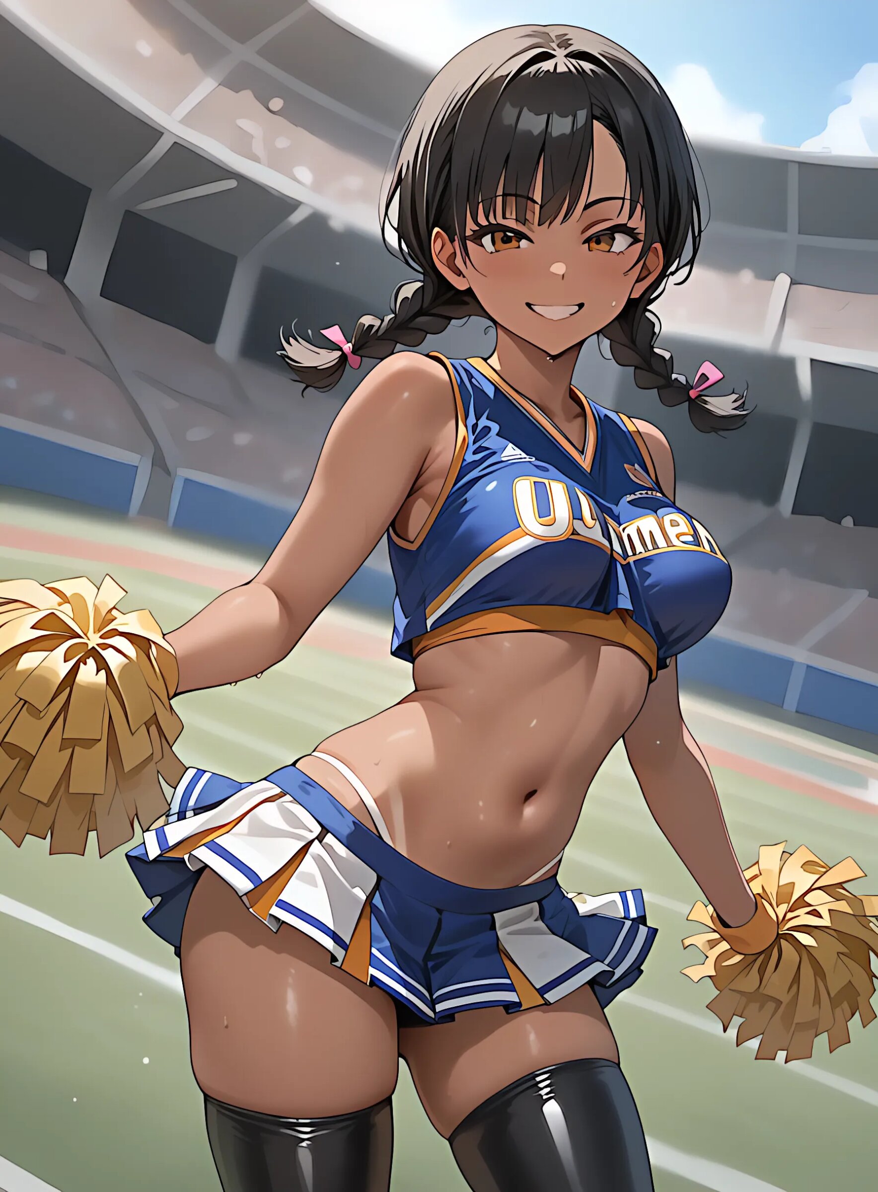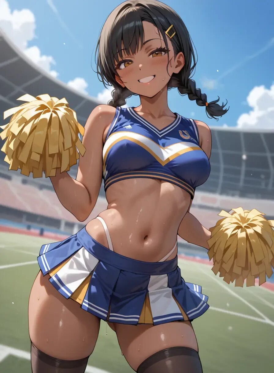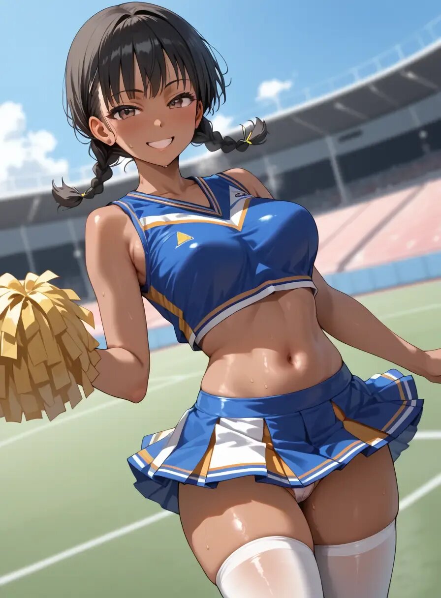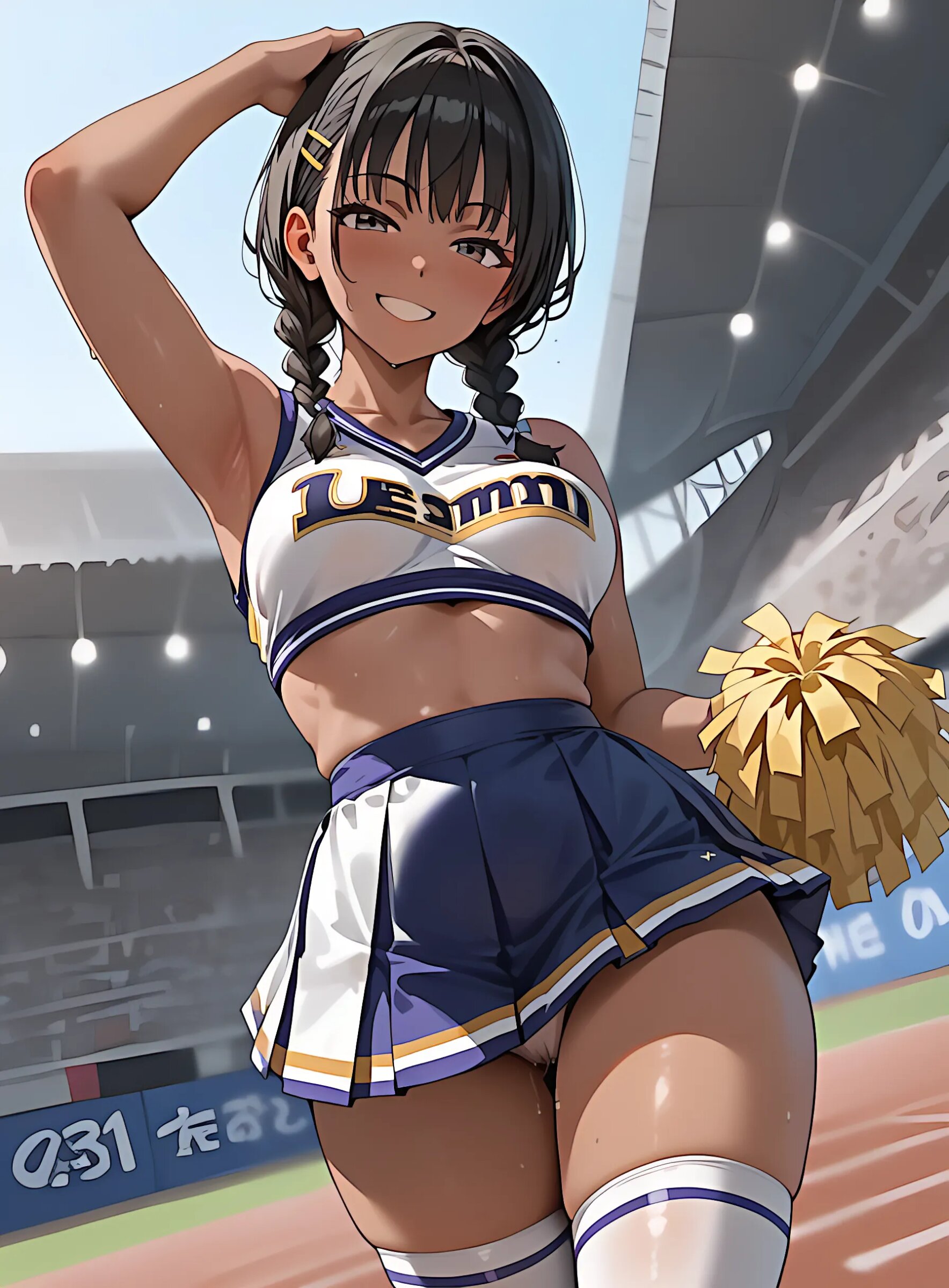 twin braids,bishoujo,early teen, black hair short cut, blurry background.tan., naughty face, tareme.brown_skin,early teen,curvy,Medium breasts,slender_waist,twin braids,bishoujo,early teen, black hair short cut, blurry background.tan., naughty face, tareme.brown_skin,early teen,curvy,Medium breasts,slender_waist,,cheerleader,mini_skirt,thighhighs,latex,seductive_smile,:d,light_blush,sweat,posing,in summer,stadium,looking_at_viewer,motion_lines,dynamic_angle,