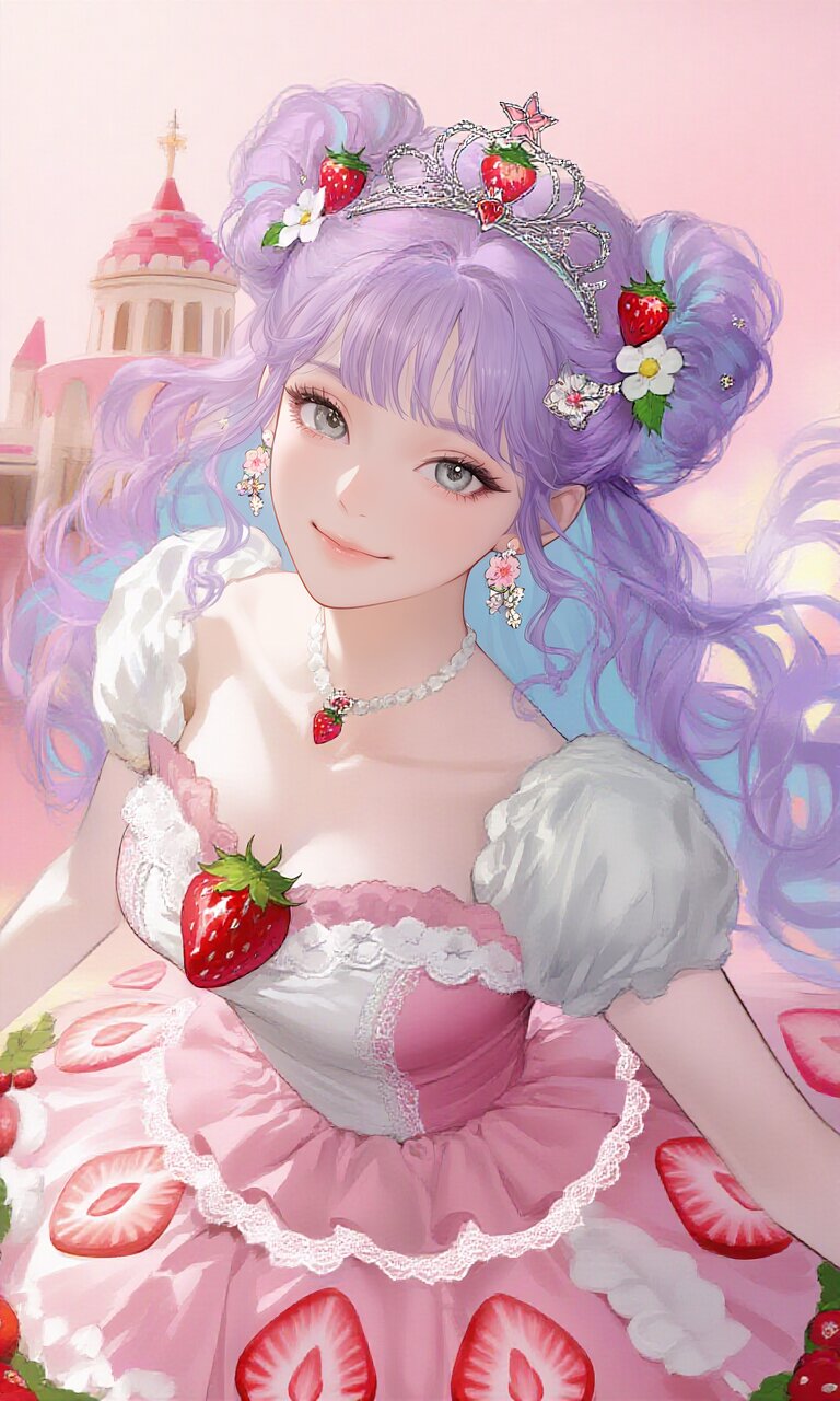 A teenage girl with pastel purple hair styled in fluffy, loosely wavy twin buns, featuring light blue inner layers, straight-cut bangs, and a star-shaped hairpin, smiles gently at the viewer. Her calm violet eyes sparkle with warmth, framed by delicate facial features and flawless, detailed skin. She wears a strawberry-themed tiara and strawberry leaf and flower decorations in her hair. Her outfit is a princess-like costume inspired by Strawberry Shortcake—a frilly, layered dress with strawberry motifs, lace trims, and pastel pink and white hues. She floats effortlessly in a dreamy, gradient pink background, surrounded by soft lighting and a magical, light atmosphere reminiscent of fairy academia. The setting includes a whimsical strawberry palace in the distance, enhancing the fantasy aesthetic. The artwork is an insanely detailed, 8K masterpiece with a happy, ethereal mood, emphasizing delicate textures, flowing fabrics, and intricate floral embellishments.